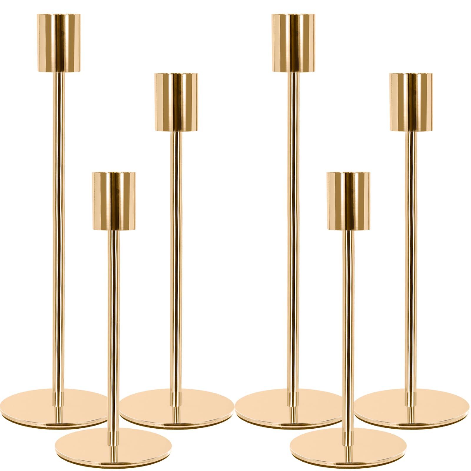 * Set de 6 bougeoirs, bougeoir en métal, haut La base est large de 8 cm et a 3 hauteurs différentes, chaque taille a 2 bougeoirs. Hauteur des bougies : 22,3/27,2/32,1 cm. Le produit n'inclut pas les bougies. Bougies en bâton de taille standard (2,2 cm), pour bougies en bâton de taille standard. * Le bougeoir en métal est fabriqué en fer de haute qualité avec un revêtement galvanisé sur la surface, ce qui préserve son éclat pendant longtemps. Le fond de la base ronde robuste est recouvert de coussinets souples, antidérapants, qui ne sont pas faciles à secouer et à faire glisser, et qui peuvent réduire les frottements sur les meubles. * Porte-bougies en or avec tige métallique filetée, il suffit de tourner l'extrémité de la tige dans le sens des aiguilles d'une montre vers la coupelle et la base de la bougie. Facile à assembler, vous pouvez facilement installer le bougeoir en quelques minutes. Le bougeoir doré est amovible et se compose de trois parties : Le sommet, la tige et la base. Il est plus facile à nettoyer et à ranger lorsqu'il n'est pas utilisé, ce qui prolonge sa durée de vie. * Les bougeoirs sont simples et élégants et conviennent parfaitement à diverses occasions telles que Noël, les mariages, les dîners, l'Avent, la décoration de table, le salon et la décoration de la maison, vous donnant une atmosphère romantique, subtile et élégante. Parfait pour tout style d'intérieur.