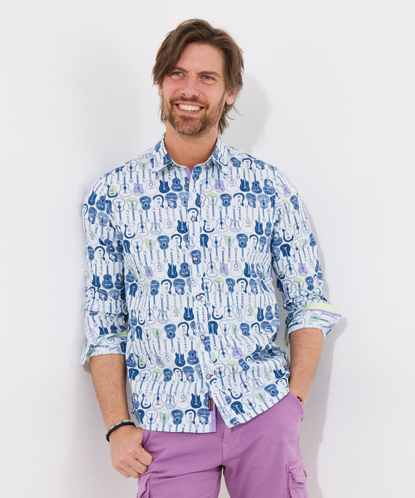 Cette chemise à manches longues présente un motif de guitare éclatant, offrant un style distinctif et ludique. Le design est accrocheur et ajoute une touche unique à toute tenue.
