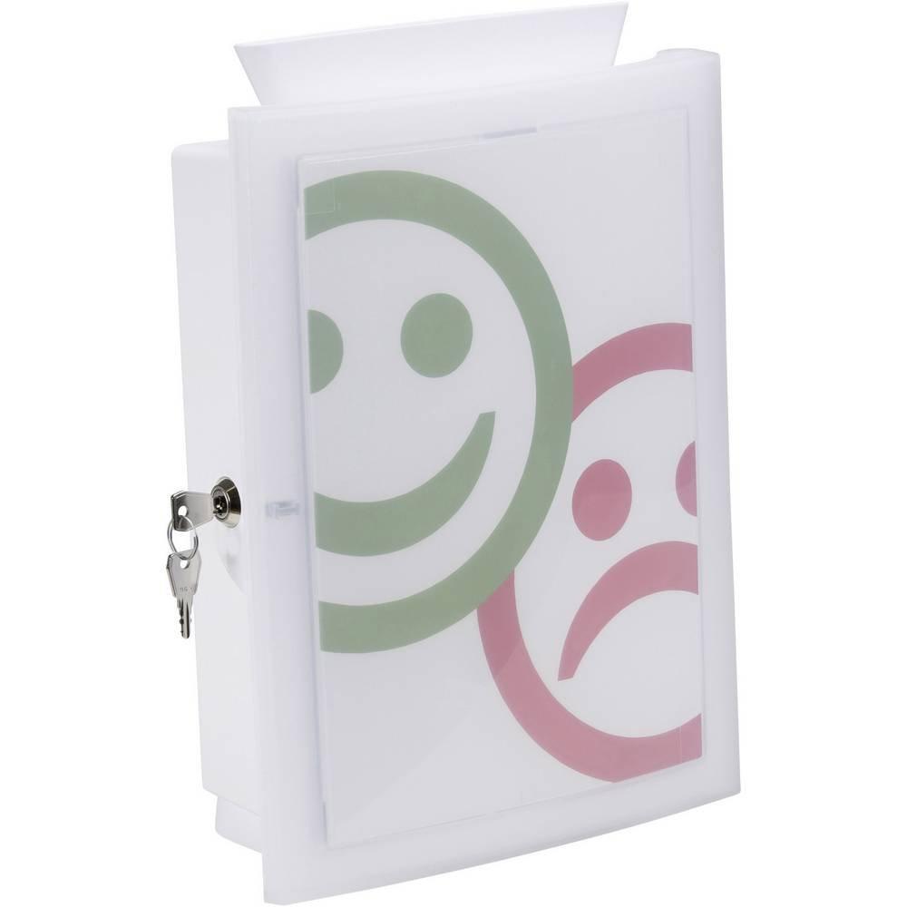 Boîte de collecte IMAGE'IN. La boîte de collecte unique avec message. Ideal pour une utilisation comme urne, boîte d'action, boîte de lot, boîte de collecte de fonds ou boîte de prise. La feuille d'information remplaçable dans la porte (DIN A4) permet une nouvelle conception de l'avant pour chaque occasion, simple et personnalisée. Utilisation mobile grâce à de grandes pieds ou également pour un montage mural. Le boîtier stable aux couleurs attrayantes est fixé par un cadenas robuste. Avec fixation murale et 2 clés de sécurité. Fabriqué en Allemagne. Dimensions extérieures (L x P x H) : 260 x 118 x 375 mm. Matériau : plastique de qualité, polypropylène (PP). Couleur du boîtier : blanc. Couleur de l'avant (porte) : translucide. Couleur de la fente : blanc.