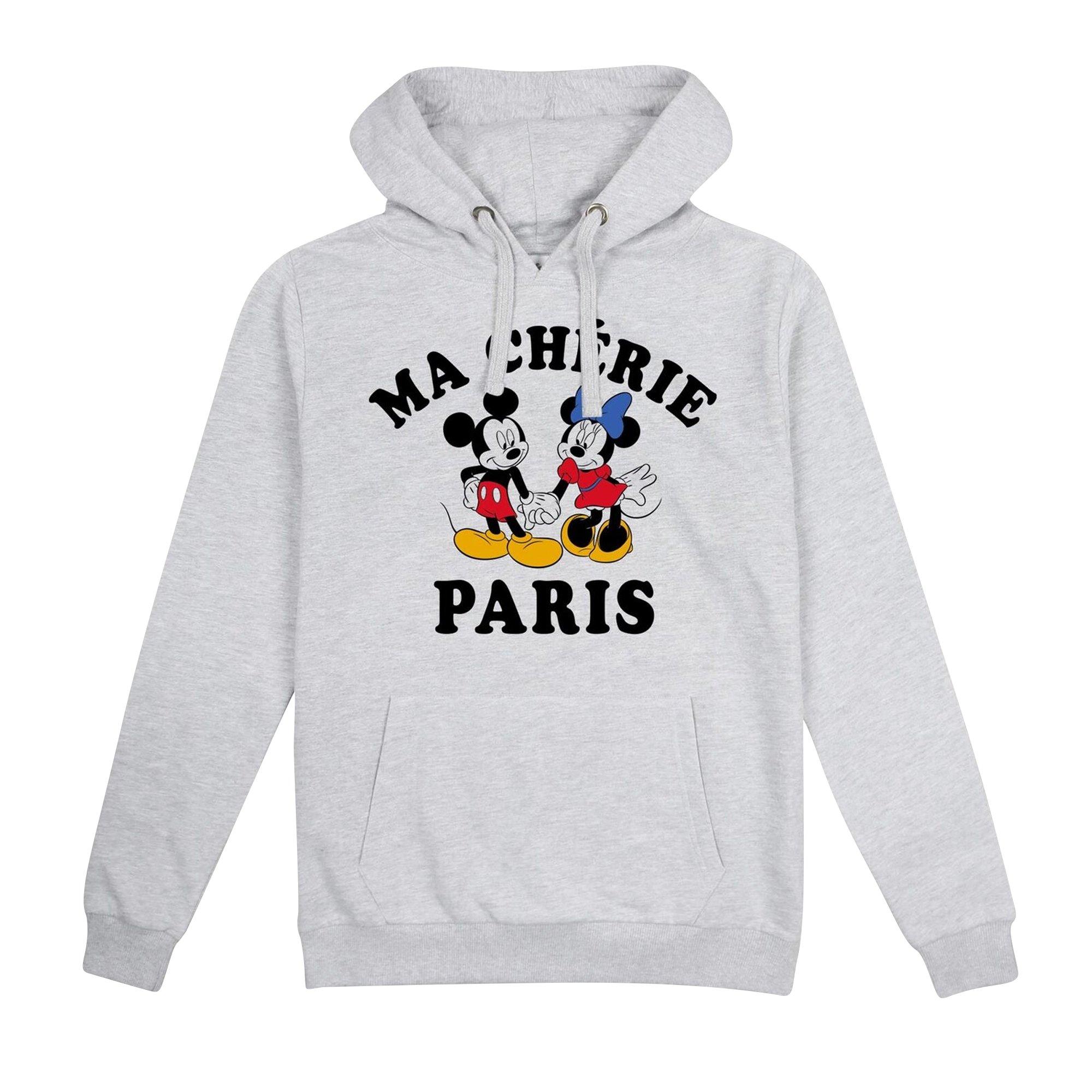Ce sweat à capuche présente un imprimé graphique ludique de Mickey et Minnie Mouse avec le texte « MA CHÉRIE PARIS » sur le devant. Il est conçu avec une capuche confortable et une poche kangourou pratique, ce qui en fait un ajout polyvalent à toute garde-robe décontractée.