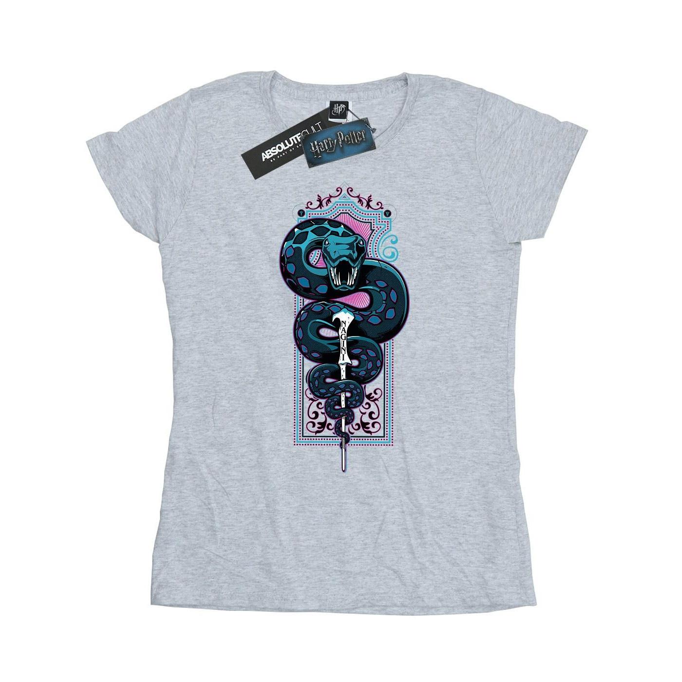 Ce T-shirt présente un imprimé graphique saisissant d'un serpent, représentant la maison Serpentard. Le design est détaillé avec des motifs complexes et des couleurs vives, ce qui en fait une pièce remarquable pour les fans de la série. Il est fabriqué à partir de 100% coton filé à l'anneau, offrant une sensation super douce et un tissu de poids moyen.