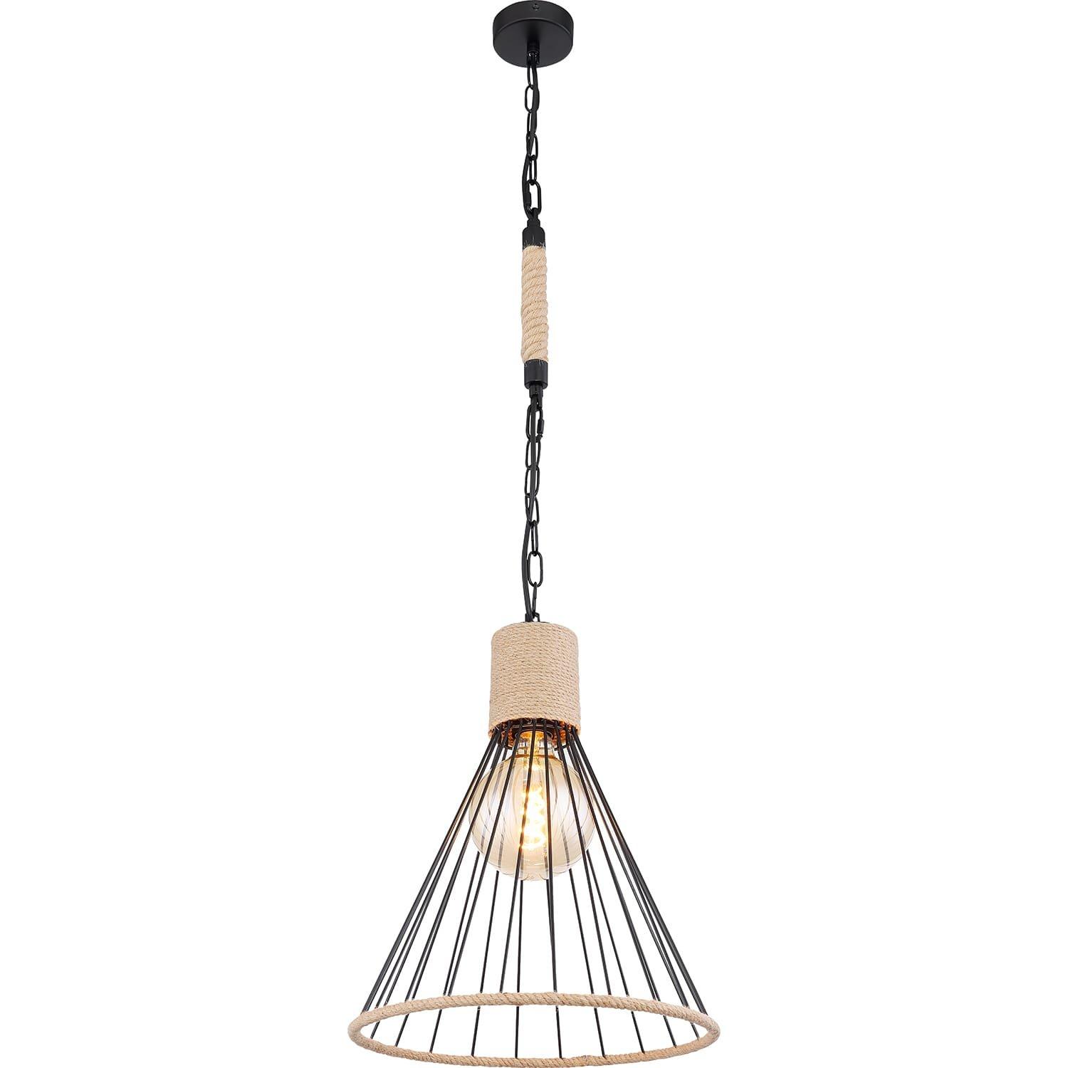 Lampe à suspension métal noir mat, corde de chanvre marron, tiges métalliques noir mat, avec chaîne noire, D: 350, H: 1400, hors 1xE27 60W 230V