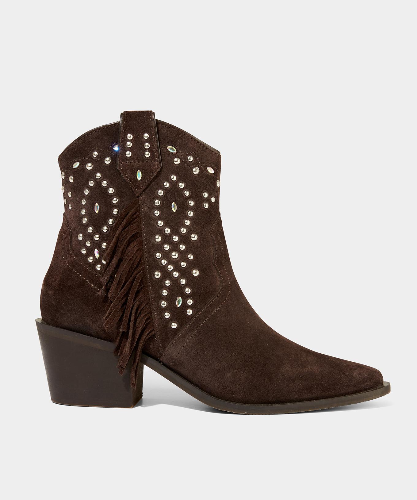 Ajoutez du peps à chaque pas avec ces bottes en daim marron à franges et strass.
