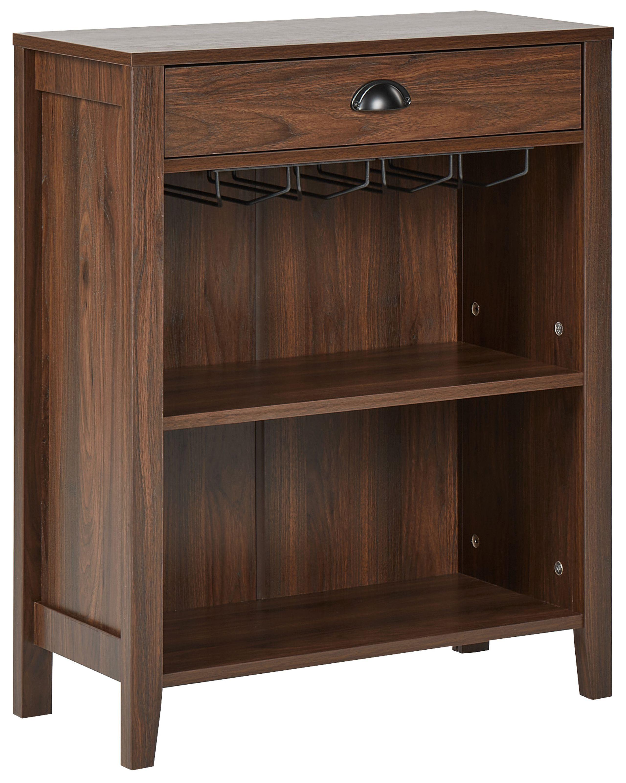 Meuble de salon avec porte-verre. Cet élégant buffet allie praticité et charme traditionnel. Il comporte deux étagères ouvertes, dont l'une est équipée de porte-verres pour un rangement pratique, et un tiroir pratique pour les petits objets essentiels. Fabriqué en panneaux de particules avec une finition aspect bois foncé, il capture la chaleur du bois naturel tout en offrant une grande robustesse. Son design intemporel en fait un complément sophistiqué à tout espace.