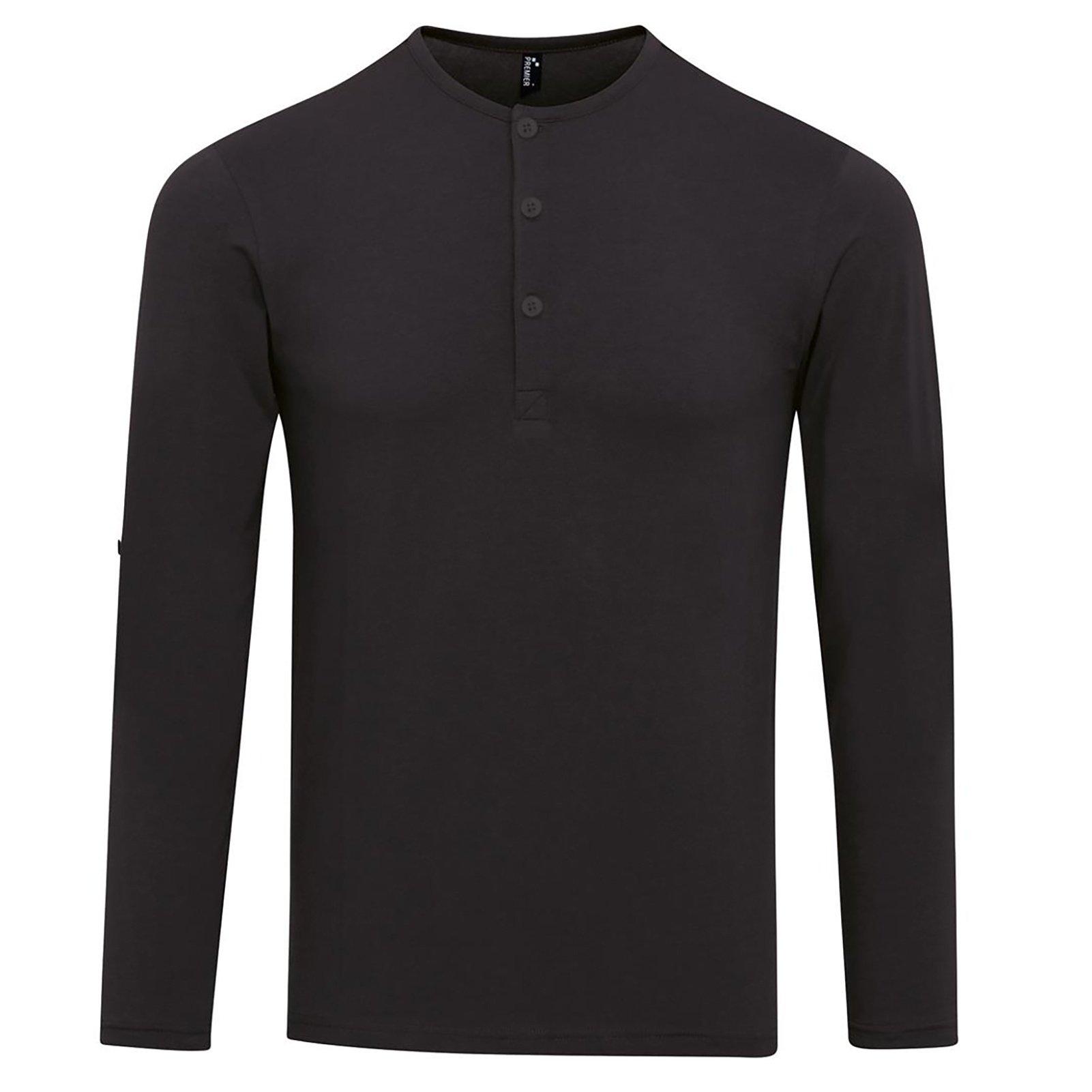 Ce t-shirt à manches longues présente un col rond classique et une patte de boutonnage pour un look polyvalent. Le design comprend un bouton sur la manche, permettant un style retroussé. Des doubles coutures sont présentes à la taille et aux poignets.