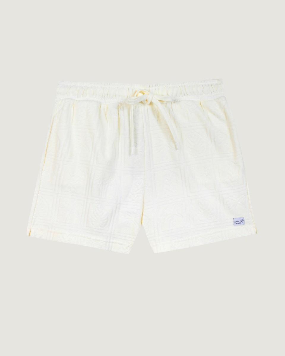 Ce short présente un motif carré sur l'ensemble du tissu, offrant une texture et un attrait visuel distinctifs. La taille élastique avec cordon de serrage assure un ajustement confortable et réglable, le rendant adapté à diverses occasions décontractées.