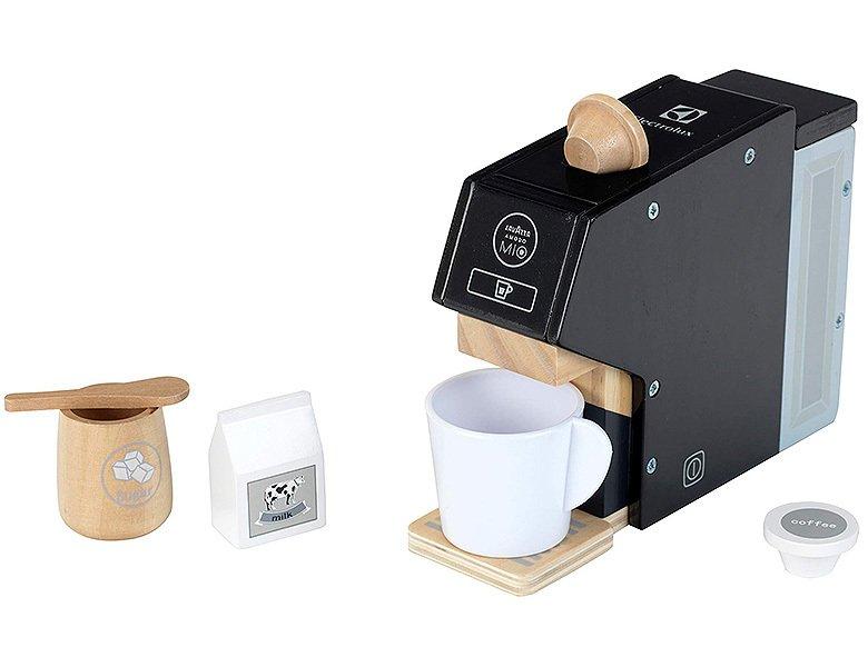 Kaffeemaschine aus Holz mit den Massen 19 x 5,5 x 14 cm. Enthalten sind zwei Kaffeepads, eine Milchpackung, eine Zuckerdose mit Löffel und eine Kaffeetasse aus Kunststoff. Sicher und ungefährlich, keine Erhitzung. Geeignet für Kinder ab 3 Jahren.