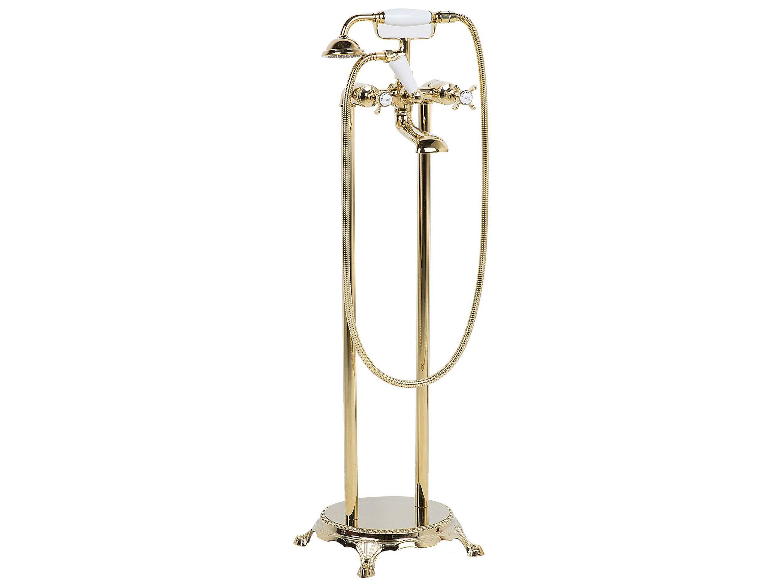 Robinet autoportant. Ce robinet de baignoire autoportant d'inspiration rétro apporte une touche de nostalgie à n'importe quel style de salle de bains. Fabriqué en laiton et en acier inoxydable avec une finition dorée brillante, le robinet est livré avec un long tube et une tête de douche joliment incurvée. Ce robinet est une mise à niveau vintage élégante pour votre baignoire, avec un design détaillé de la poignée du robinet ʺchaud et froidʺ.