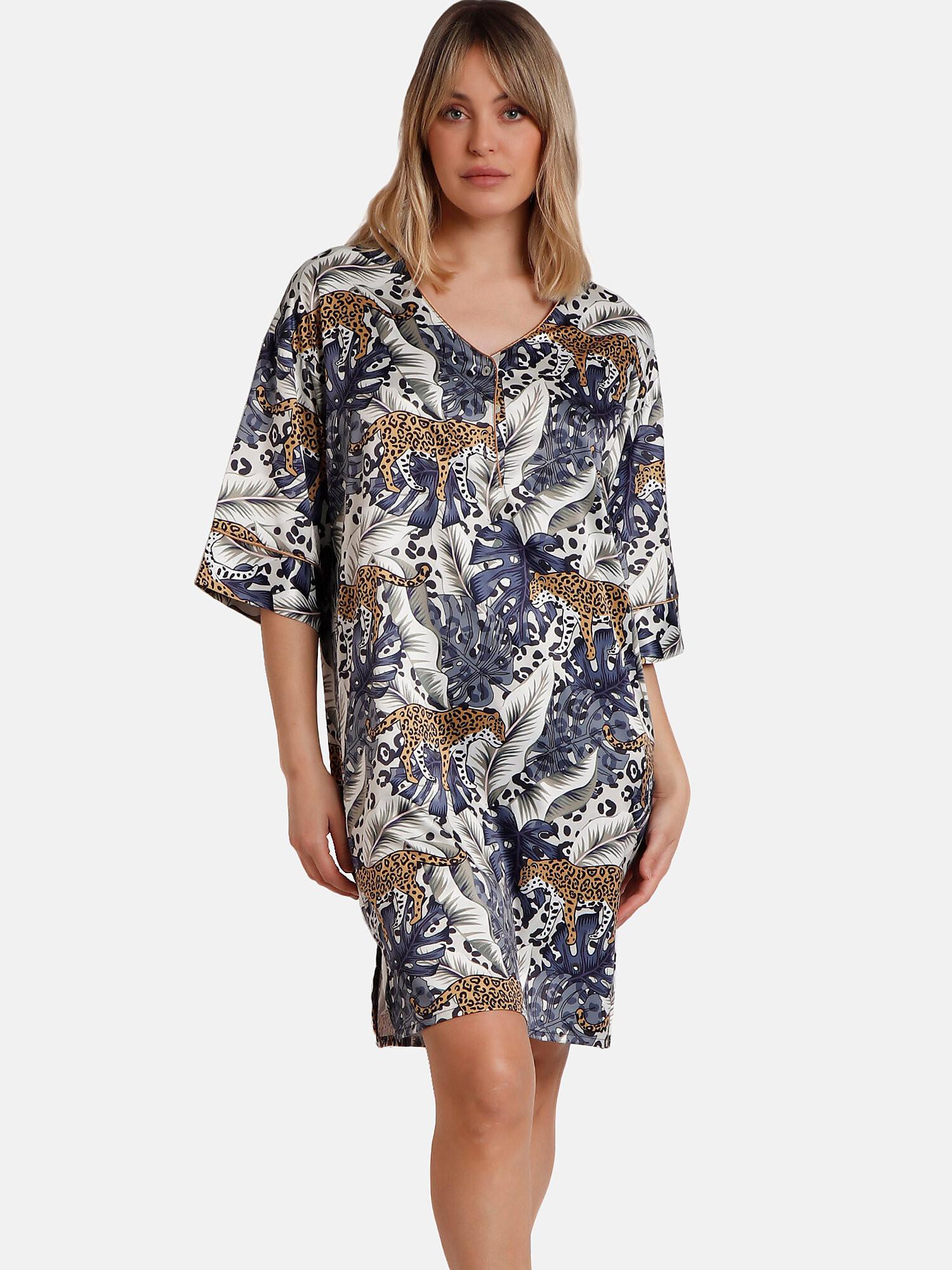 Cette chemise de nuit luxueuse présente un imprimé animal et végétal élégant, offrant une option confortable et à la mode pour les vêtements de nuit ou de détente. Les manches mi-longues et l'encolure en V offrent une coupe décontractée, tandis que le tissu satiné est doux sur la peau et fluide sur le corps. Le large col en V se termine par une patte de boutonnage, ce qui le rend pratique pour diverses utilisations, y compris l'allaitement.