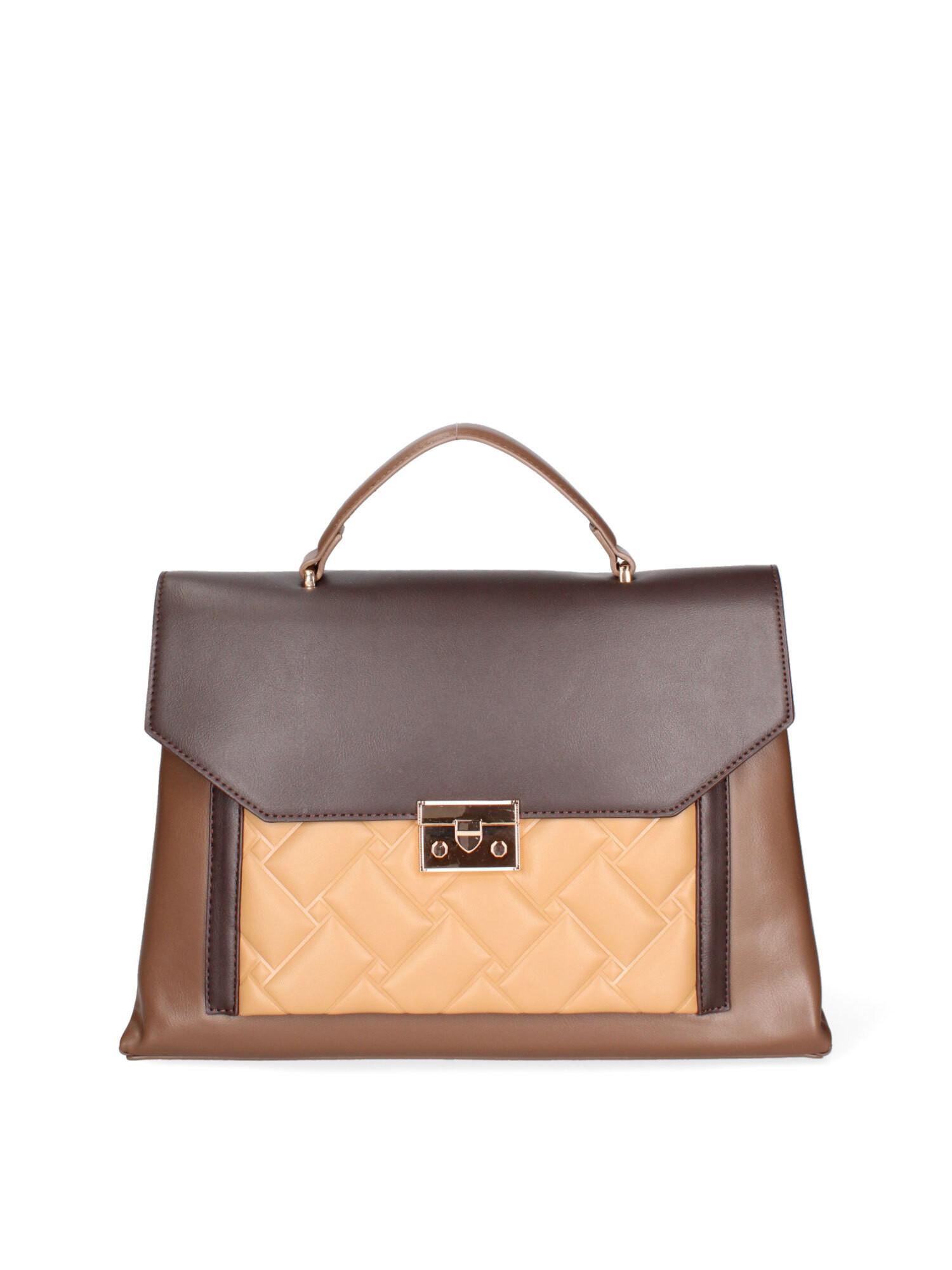 Ce sac à main présente un design sophistiqué avec une fermeture à rabat et un motif matelassé distinctif sur le devant. Il est équipé d'une poignée supérieure pour un transport facile et d'une fermeture à fermoir sécurisée. Le sac comprend une poche intérieure zippée, deux poches intérieures ouvertes et une poche extérieure zippée à l'arrière pour un rangement organisé. Une bandoulière amovible en similicuir offre des options de transport polyvalentes.