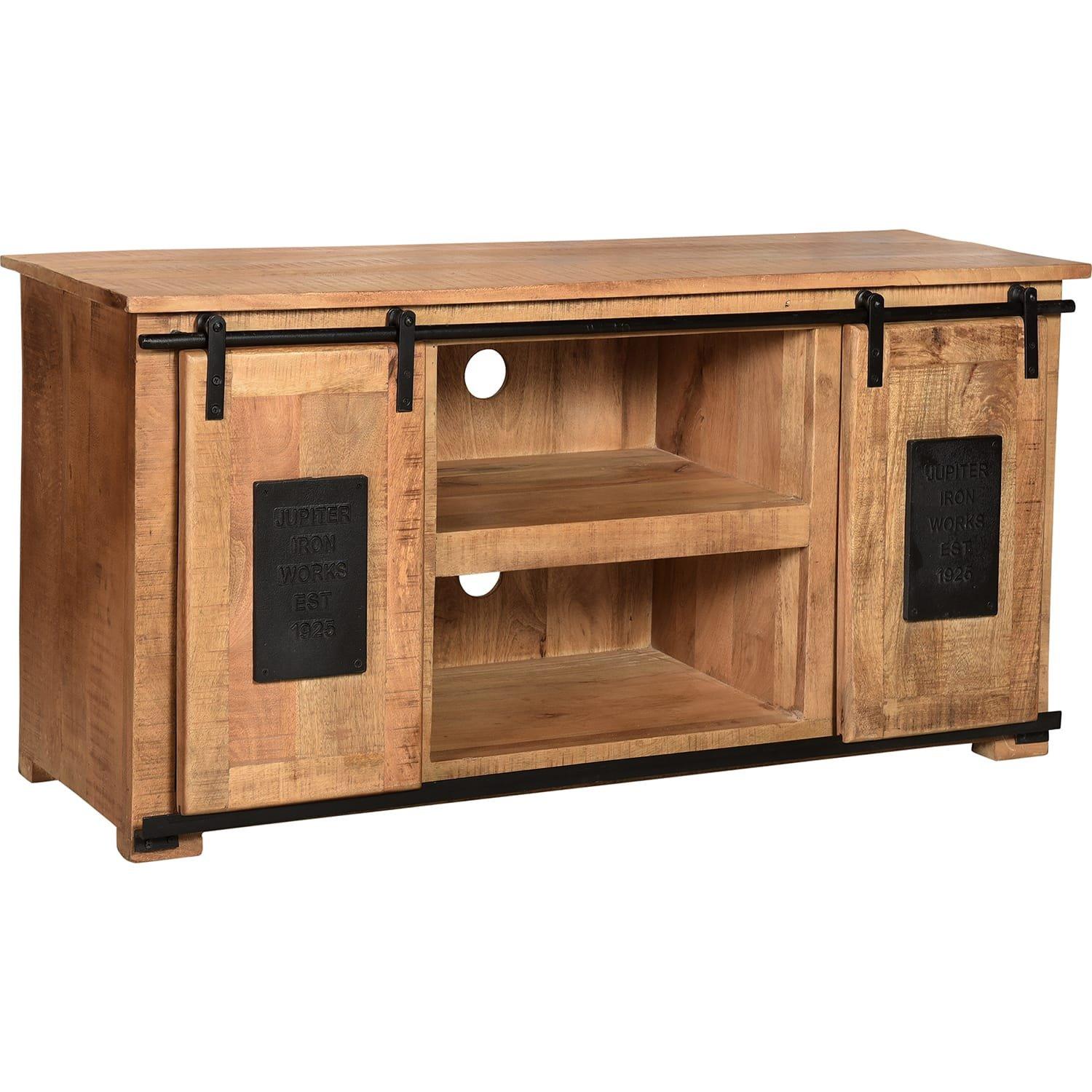 La combinaison du bois de manguier de couleur naturelle et des lourdes ferrures métalliques en noir antique offre un contraste séduisant et confère au lowboard un charme rustique. Grâce à l'aspect naturel du bois de manguier, il s'accorde bien avec de nombreux styles d'habitat différents. Le lowboard offre de la place pour vos appareils hi-fi grâce à deux compartiments ouverts. Le passage des câbles ne pose aucun problème grâce aux trous dans le panneau arrière. Deux autres compartiments, fermés par des portes coulissantes, offrent un espace de rangement supplémentaire, les portes coulissantes pouvant également fermer les compartiments du milieu si nécessaire, ce qui change complètement l'aspect du banc TV. Beauté et utilité ne sont donc pas ici contradictoires.Dimensions des compartiments 45x37x22 cm, derrière les portes 35/28x34x48 cm, pas d'étagères.avec 2 portes coulissantes pratiques et peu encombrantesferrures rustiques en métal noir antique2 compartiments ouverts pour le passage des câblesen bois de manguier naturelLowboard de la série NAMUR