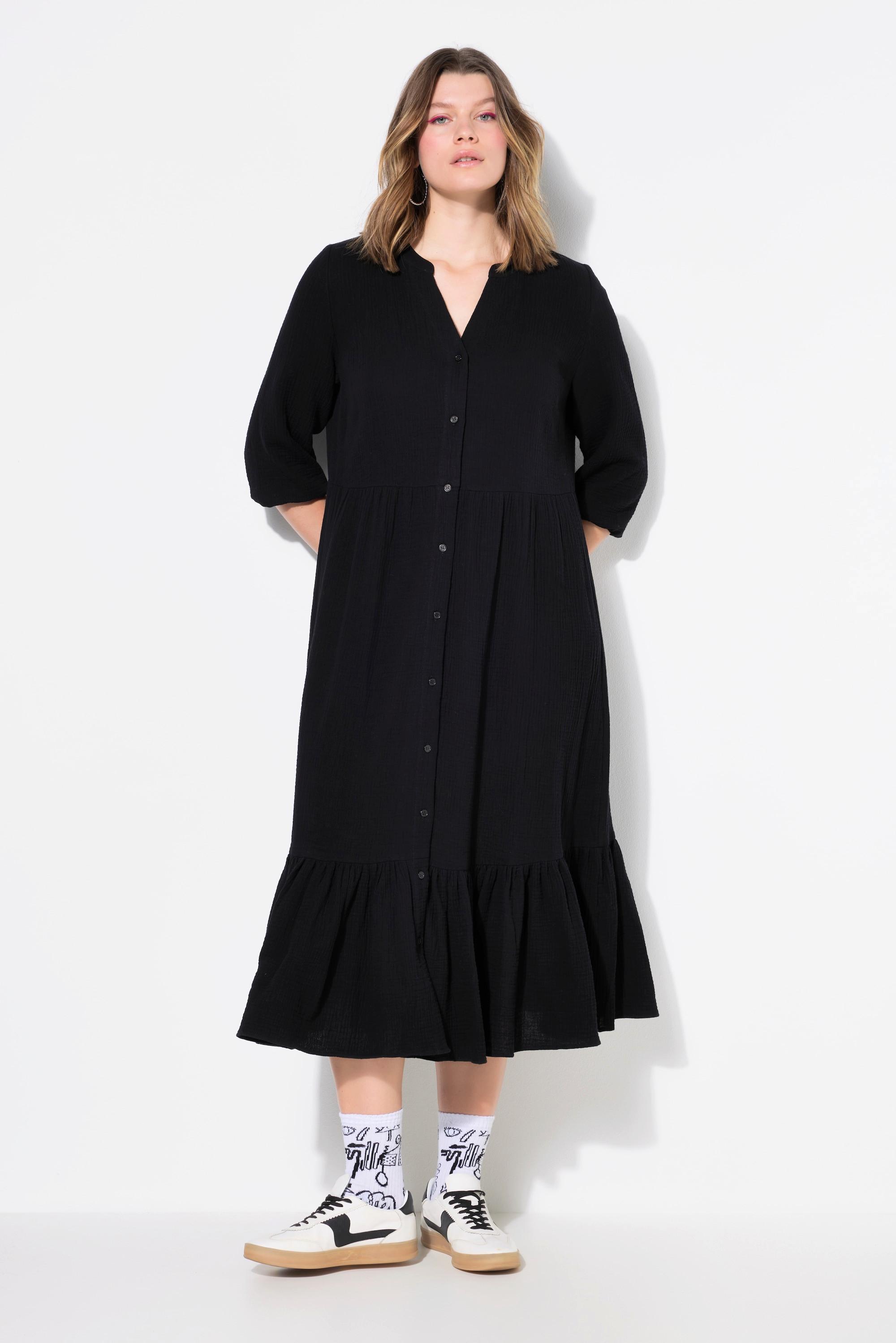Cette robe maxi évasée est confectionnée en tissu mousseline doux, offrant une silhouette confortable et fluide. Le design présente une fermeture boutonnée sur le devant et un décolleté en V, ce qui en fait un ajout polyvalent à toute garde-robe.