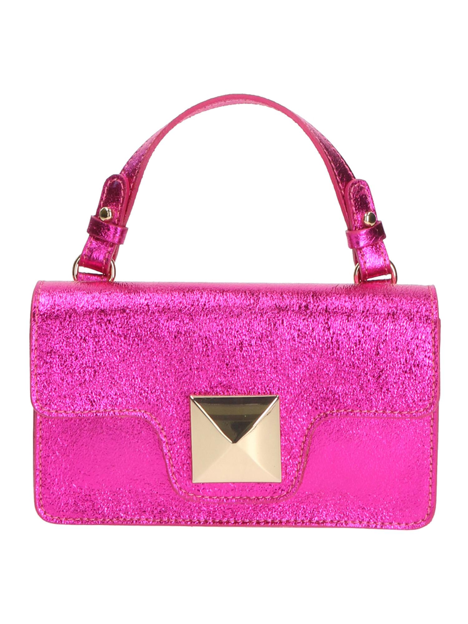 Ce sac à main présente une finition métallique chatoyante, ajoutant une touche de glamour à n'importe quelle tenue. Le design structuré est complété par un détail de clou pyramidal proéminent sur le rabat avant, servant à la fois d'élément décoratif et de fermeture sécurisée. Il est équipé d'une poignée supérieure pour un porté élégant et d'une bandoulière amovible pour un usage polyvalent. Ce produit artisanal italien est fabriqué en cuir laminé.