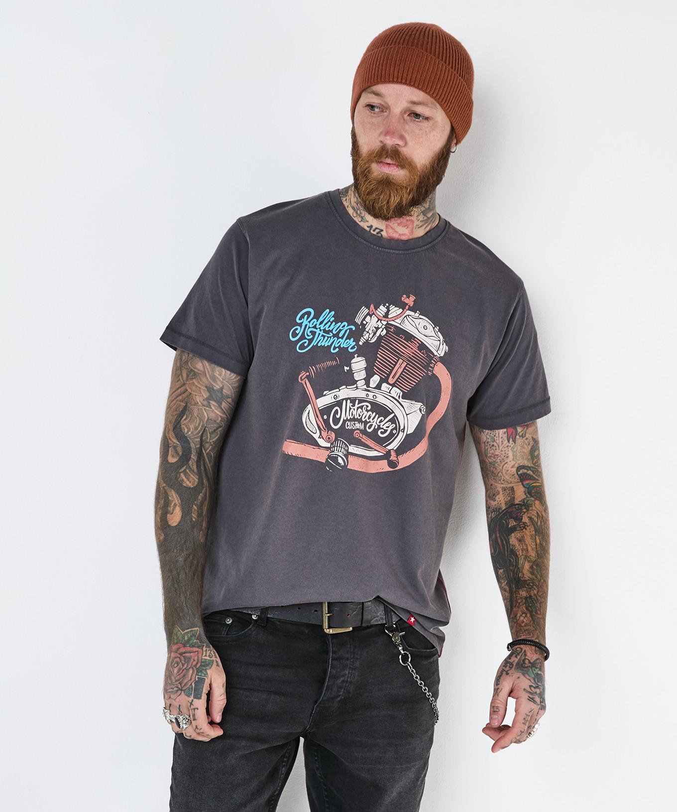 Ce t-shirt délavé à l'huile, orné d'un motif distinctif de moteur de moto, offre un look robuste mais élégant. Le design capture l'essence de la culture des motos custom, en faisant un ajout polyvalent à une garde-robe décontractée.