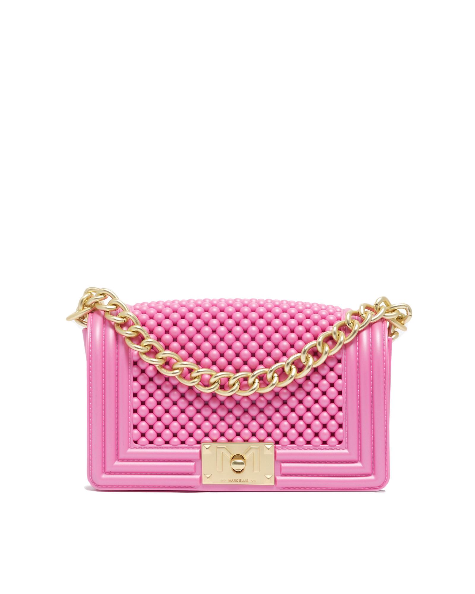 Sac à main pour femme. La fermeture est avec un twist. Les poches internes sont absentes. Les poches extérieures sont absentes. La bandoulière est en chaîne. Il manque la poignée. Il y a un compartiment interne. Le matériau extérieur est du PVC. À l'intérieur, c'est du PVC. Dimensions : 19x11x6,5 cm. Produit de mode