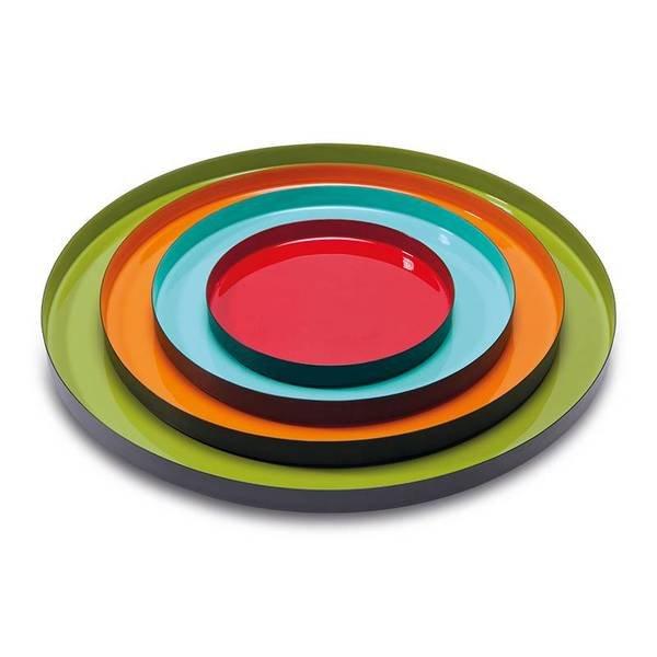 Magnifique jeu de plateaux en design minimaliste. Les quatre couleurs parfaitement assorties de ce jeu de plateaux apportent une touche particulièrement noble grâce à leur surface émaillée brillante et créent ainsi un contraste étonnant avec le dessous en noir mat revêtu par poudre. Un ensemble polyvalent en quatre tailles ascendantes - tellement pratique pour servir des délices gastronomiques. Si élégant pour regrouper des bougies, vases ou décorations saisonnières. Un accroche-regard dans chaque maison. Jeu de 4 plateaux ronds de différentes couleurs, tailles ascendantes, empilables. Dimensions : Ø 17 / 25 / 32 / 39 cm, hauteur du bord 2 cm chacun.