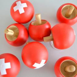 La toupie à revers est une toupie physiquement spéciale qui tourne à l'envers en tournant. Elle a été brevetée par H.Sperl le 7 octobre 1891, en bois dur, rouge avec croix Suisse, Ø 32mm.