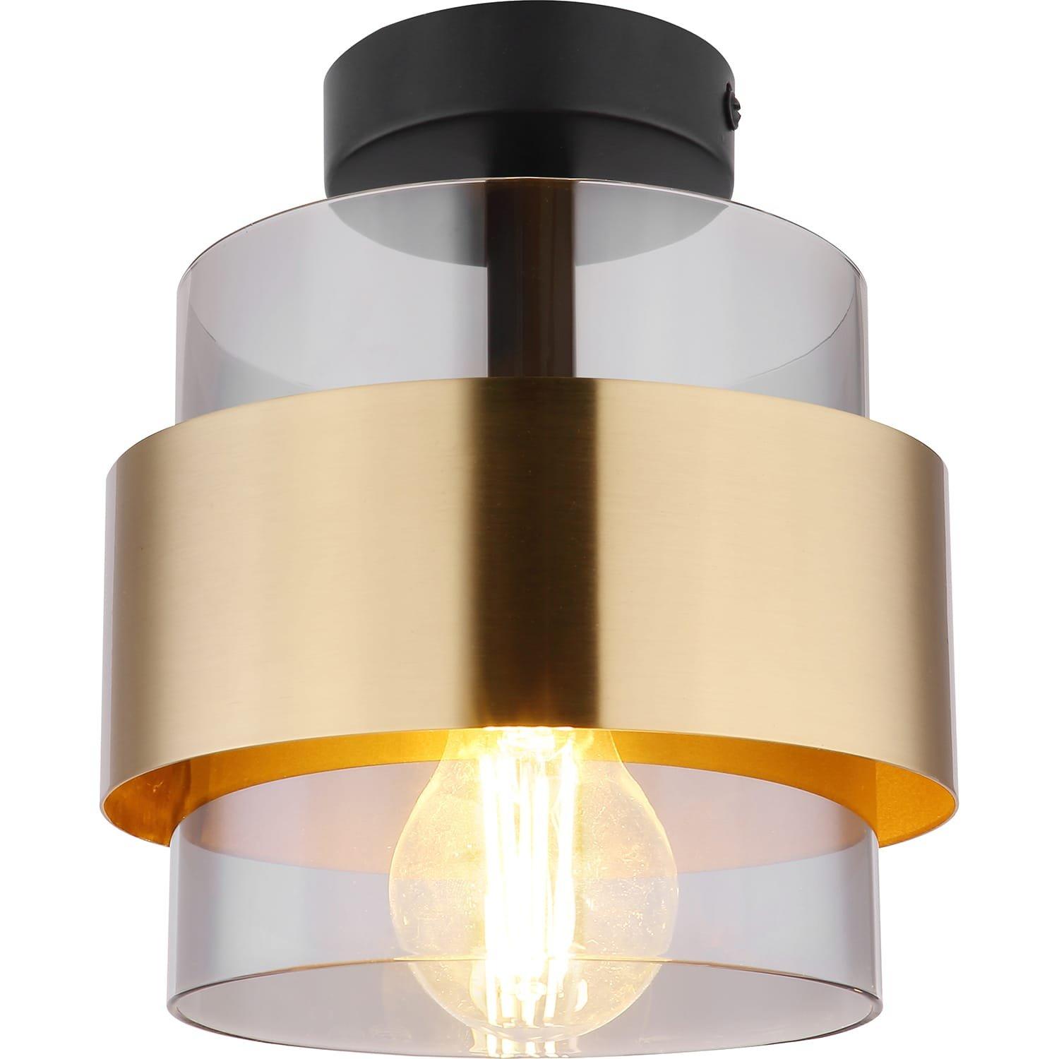 Plafonnier métal noir mat, verre, anneau laiton, : 180mm, H: 215mm, exclu 1x E27 60W 230V.