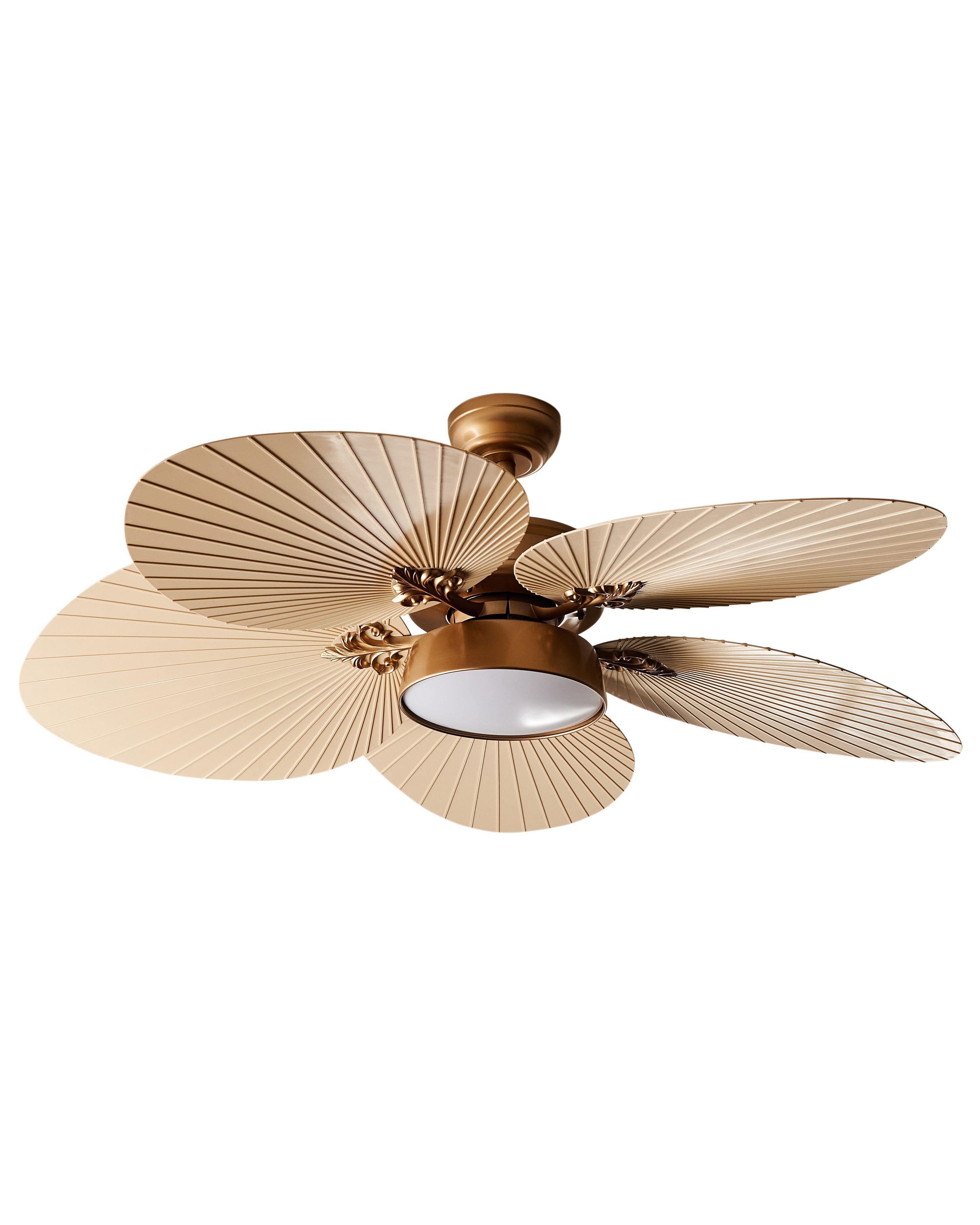 Ventilateur de plafond oriental avec éclairage LED. Le ventilateur de plafond ambiant avec éclairage LED et minuterie est un complément extrêmement fonctionnel pour un intérieur traditionnel et rétro. Les ornements dorés et les cinq pales, inspirés des ventilateurs à main, lui confèrent une touche de style oriental. Le ventilateur de plafond est livré avec une télécommande sans fil, ce qui vous permet de modifier le niveau de vitesse ou la température de l'éclairage sans vous lever de votre lit ou de votre canapé.