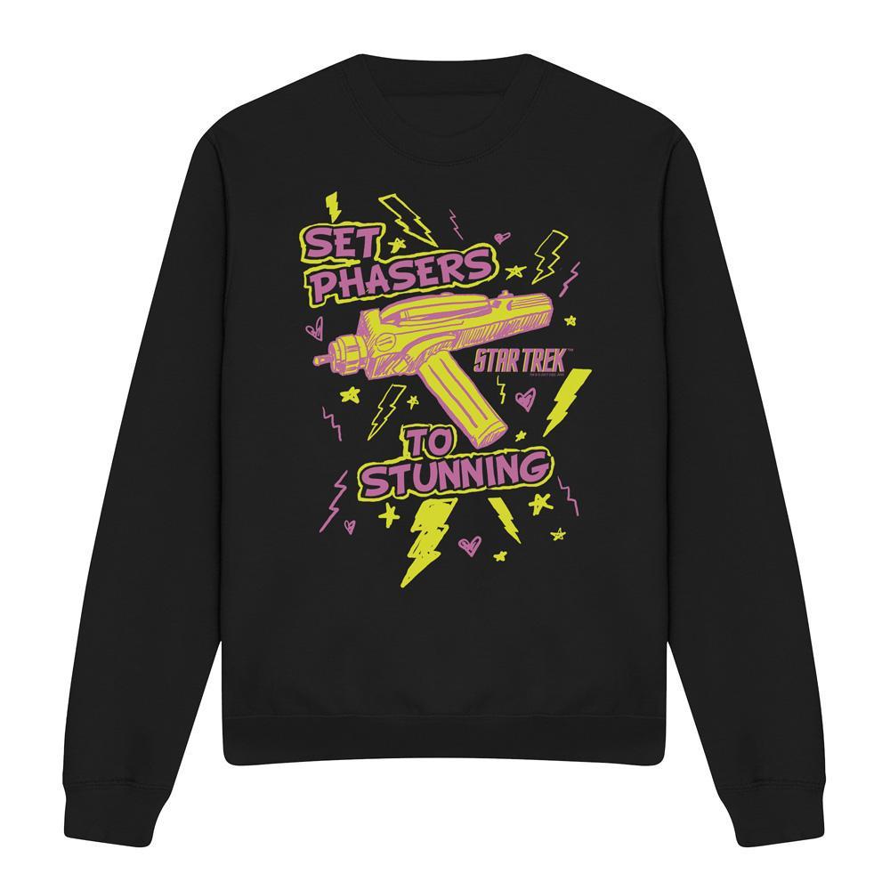 Le sweat Set Phasers présente un imprimé graphique ludique inspiré de Star Trek. Ce sweat-shirt confortable à col rond est un ajout polyvalent à toute garde-robe décontractée, parfait pour les fans de la série emblématique.