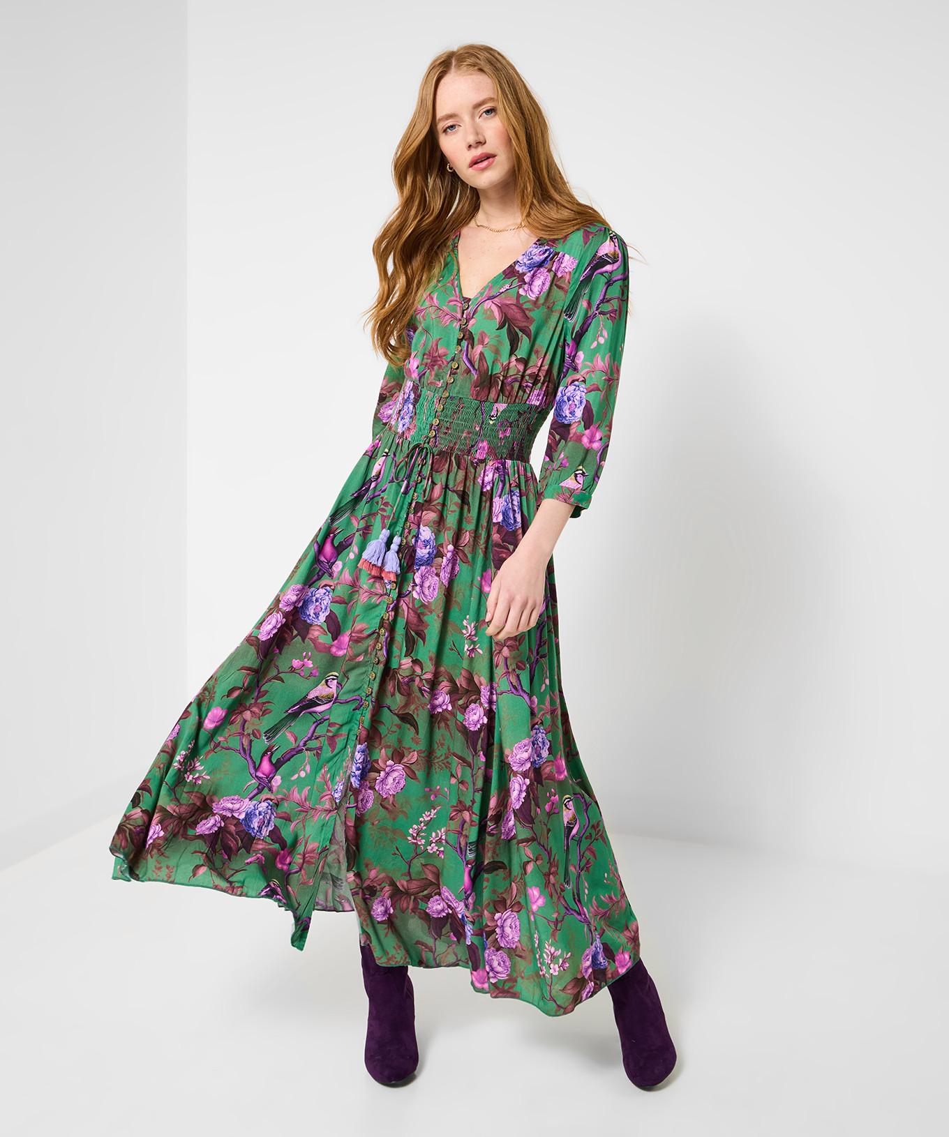 Cette robe longue présente un motif vif d'oiseaux et de fleurs, offrant un look d'inspiration bohème. Le design comprend un décolleté en V et des manches trois-quarts, ce qui en fait un ajout polyvalent à toute garde-robe. La taille smockée offre une coupe confortable et flatteuse, tandis que la patte de boutonnage complète ajoute une touche classique.