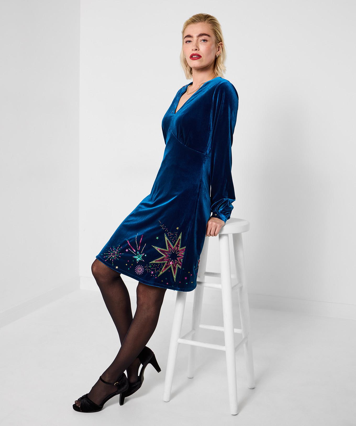 Cette robe en velours extensible présente un décolleté en V et des manches longues, offrant une silhouette confortable mais élégante. Le design est rehaussé de paillettes, ajoutant une touche d'éclat au vêtement, parfaite pour les fêtes et les cocktails.