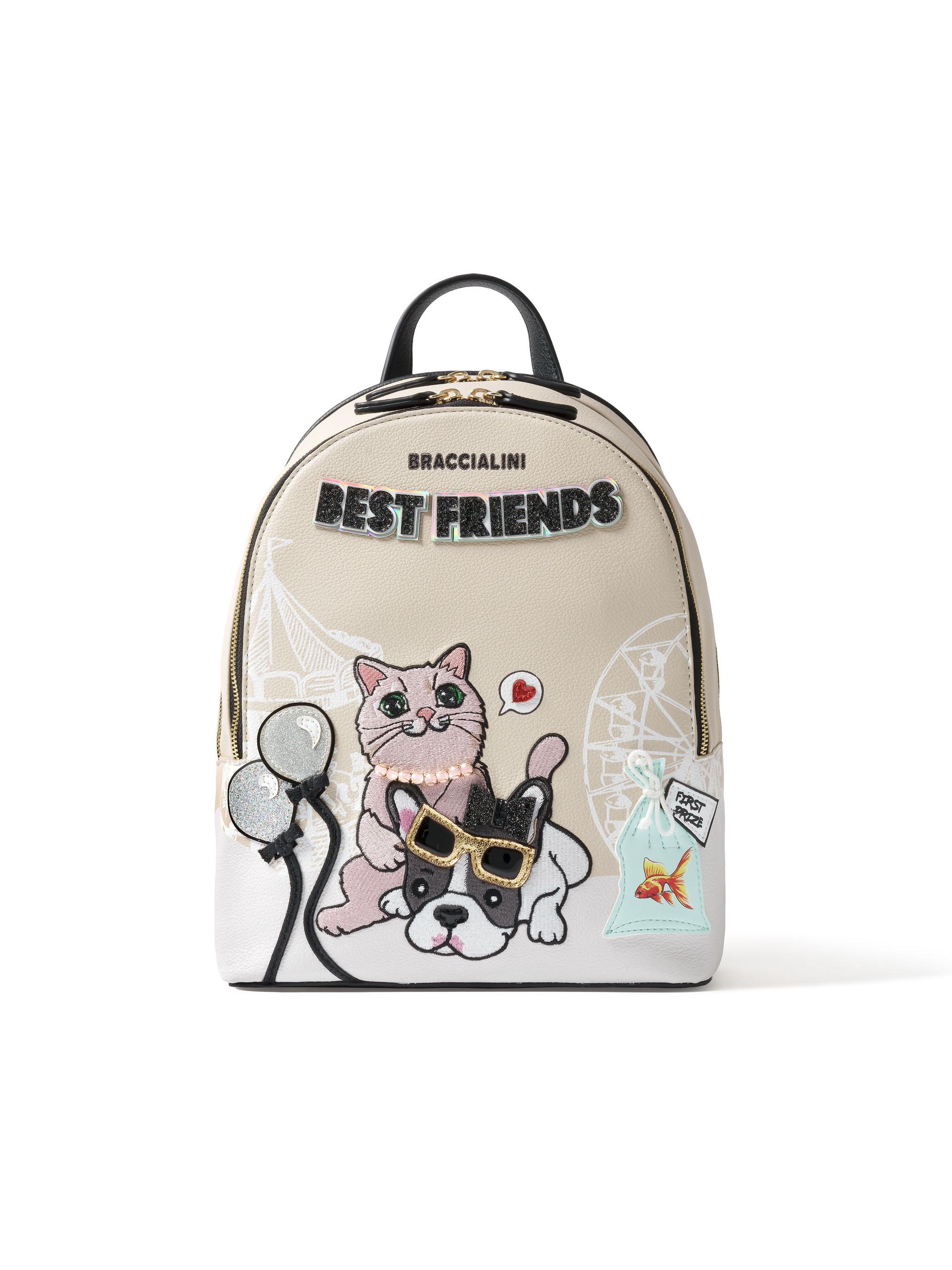 Ce sac à dos pour femme présente un charmant design avec des détails brodés d'un chat et d'un chien, célébrant l'amitié. Le sac à dos est orné du texte «BEST FRIENDS» sur le devant, ajoutant une touche ludique à son élégant schéma de couleurs beige et blanc. C'est un accessoire élégant pour un usage quotidien.