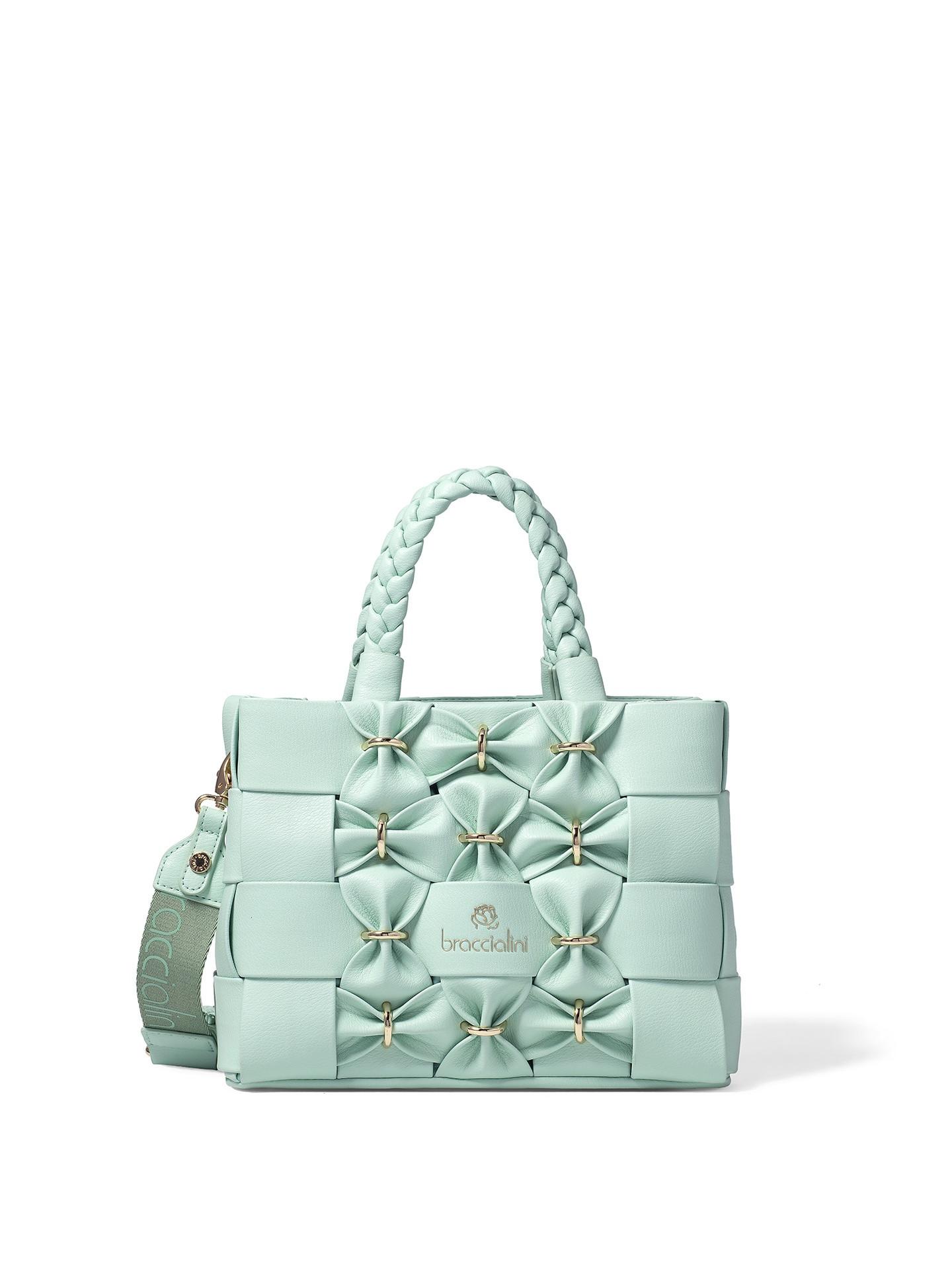 Ce sac à main présente un design tressé unique avec des accents décoratifs en forme de nœud sur le devant, fixés par des anneaux dorés. Le sac est équipé d'une poignée supérieure tressée et d'une bandoulière détachable et réglable pour des options de transport polyvalentes. L'intérieur offre un rangement pratique pour les essentiels quotidiens.