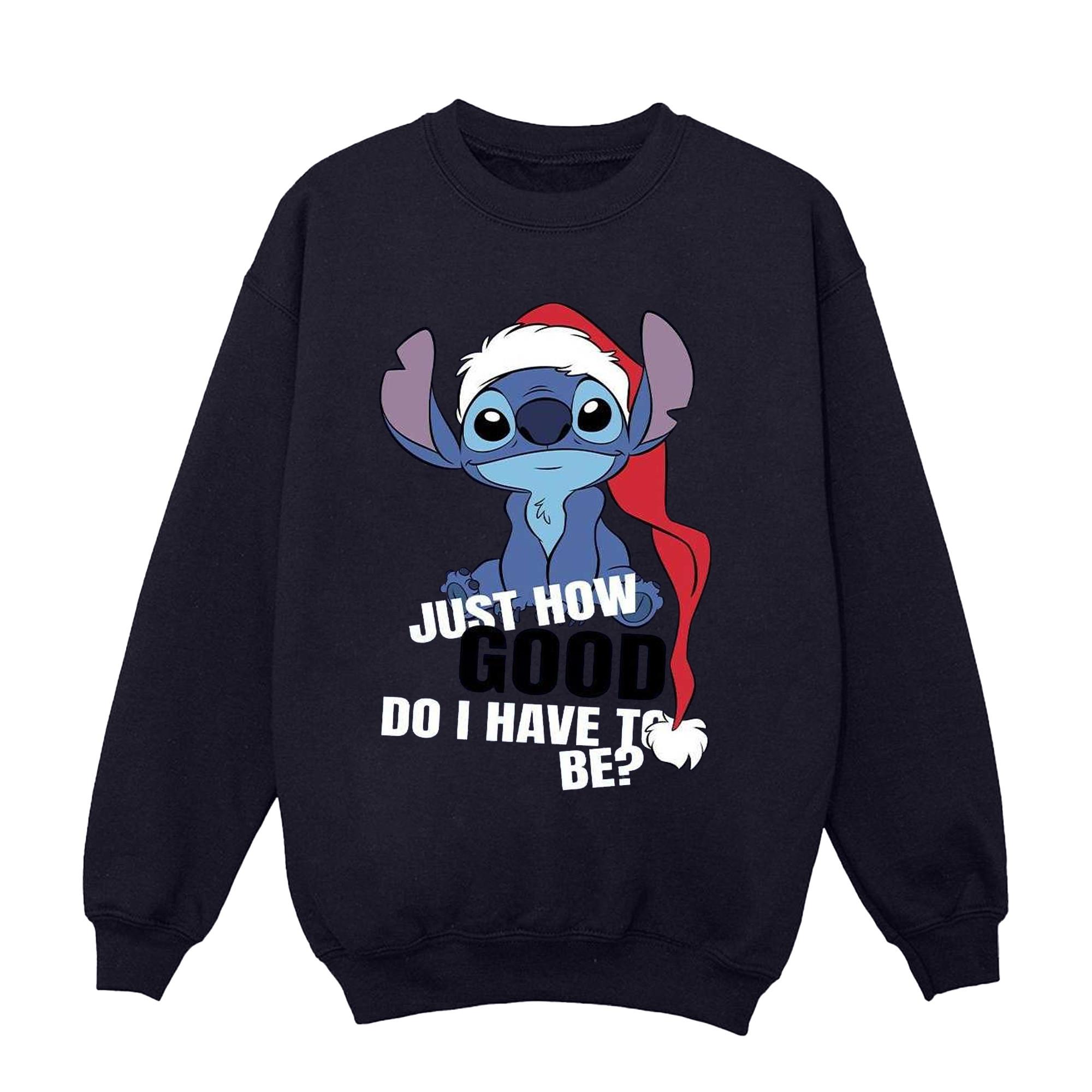Ce sweatshirt présente un imprimé graphique ludique de Stitch de Lilo & Stitch de Disney, portant un bonnet de Noël, accompagné du texte « JUST HOW GOOD DO I HAVE TO BE? ». Le design ajoute une touche de charme festif et d'humour à un vêtement classique.