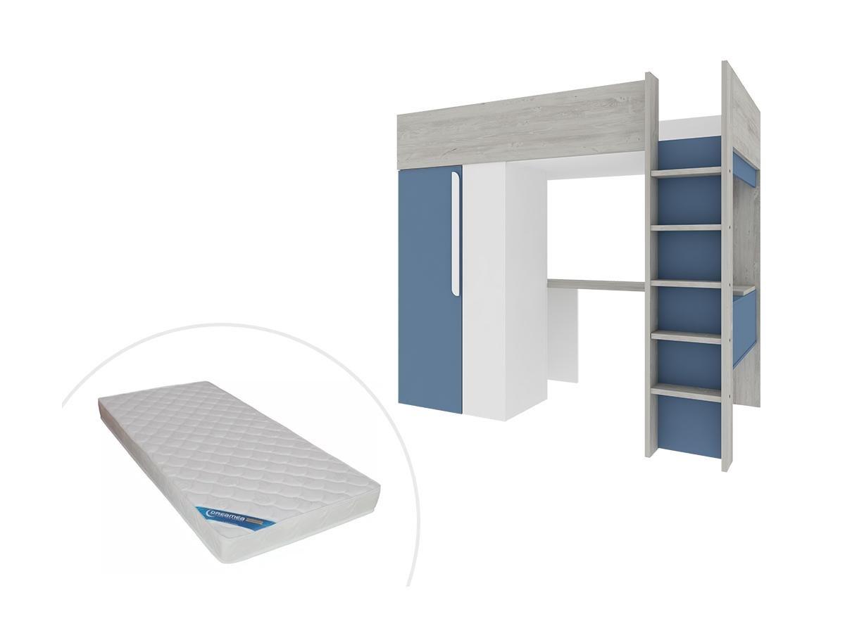 Vente-unique, Lit mezzanine 90 x 200 cm avec armoire et bureau - Bleu et blanc + matelas - NICOLAS