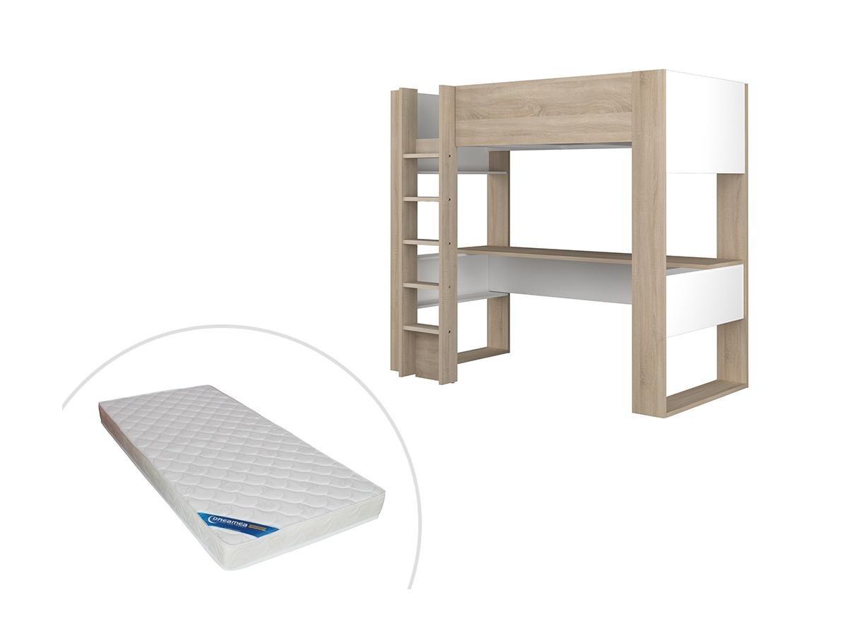 Vente-unique, Lit mezzanine avec bureau et rangements intégrés - 90 x 200 cm - Chêne et blanc + matelas - NOAH II