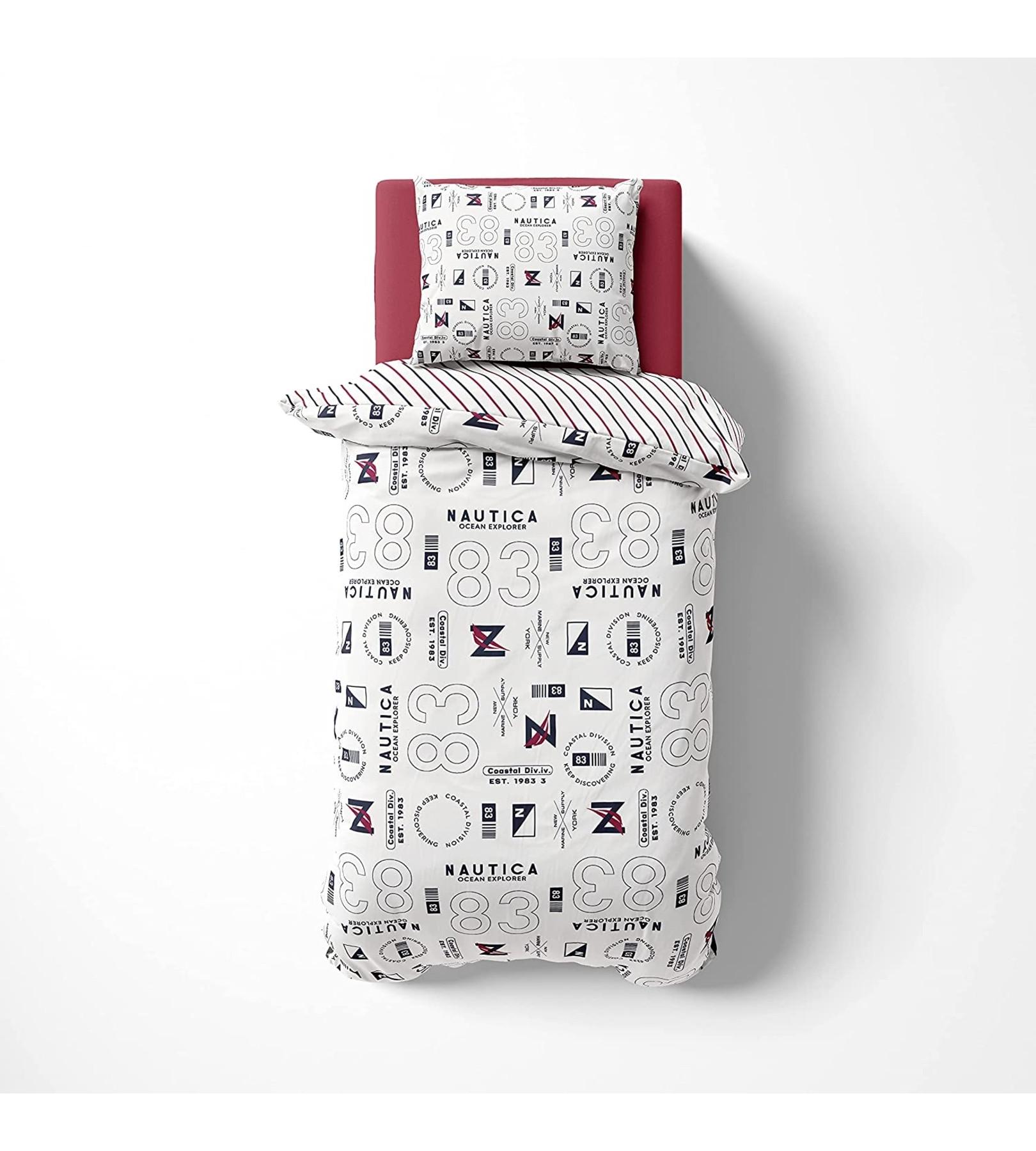 Le set de linge de lit Discovery présente un design moderne avec divers motifs d'inspiration nautique et des éléments textuels. La housse de couette et les taies d'oreiller sont ornées de graphiques incluant le numéro '83', 'Nautica Ocean Explorer' et 'Coastal Div. Est. 1983'. Le revers de la housse de couette présente un motif rayé, offrant un look polyvalent.