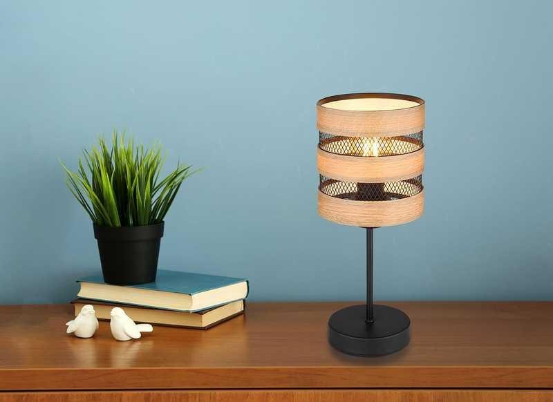 Lampe à poser métal noir mat, treillis métallique noir, aspect bois MDF foncé, câble PVC noir, interrupteur à bascule sur le câble, : 150mm, H: 335mm, longueur de câble 1500mm, exclu 1x E27 40W 230V.