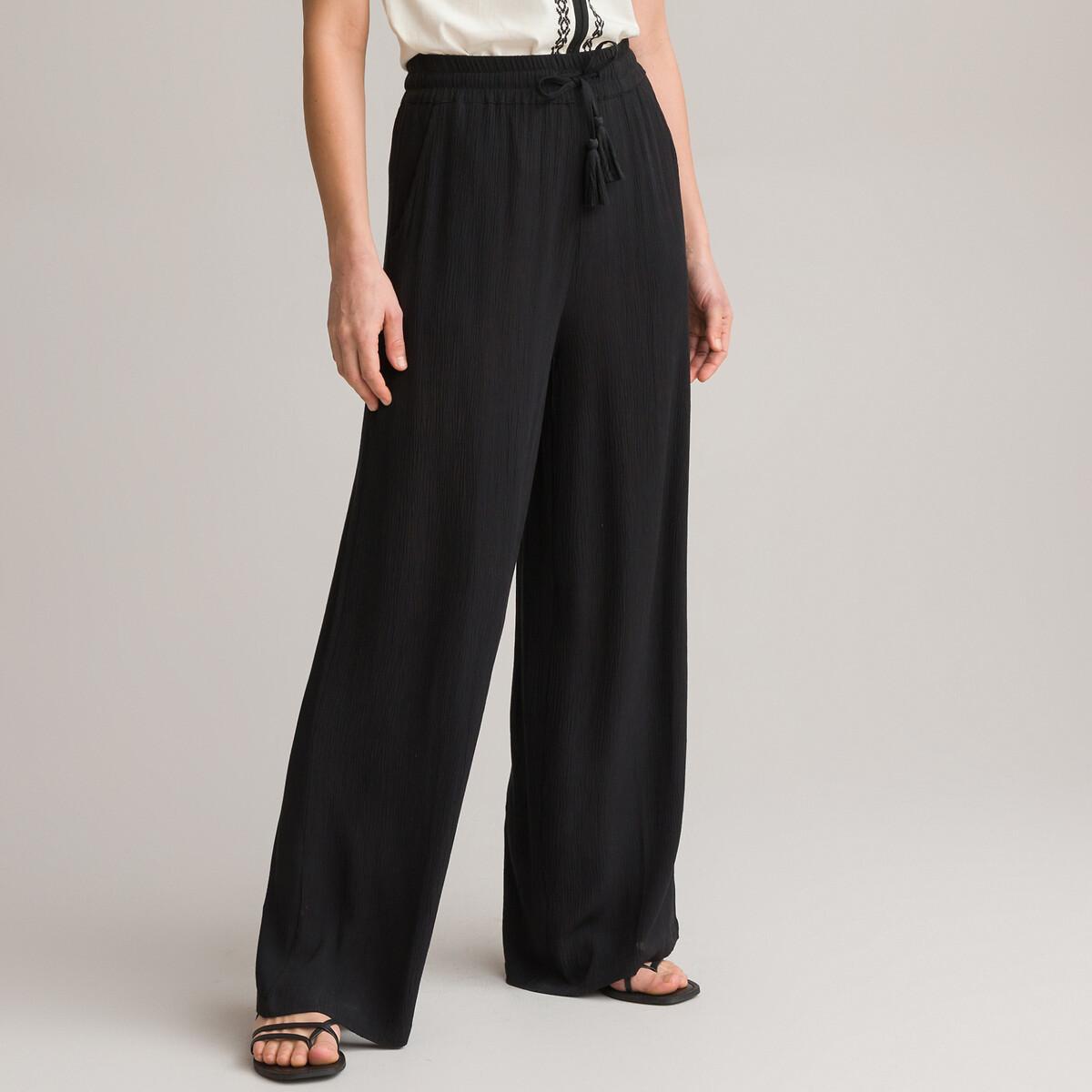 Ce pantalon large en crêpon offre une silhouette décontractée et fluide. Le design présente une taille élastiquée avec un lien à nouer, assurant un ajustement confortable et réglable.