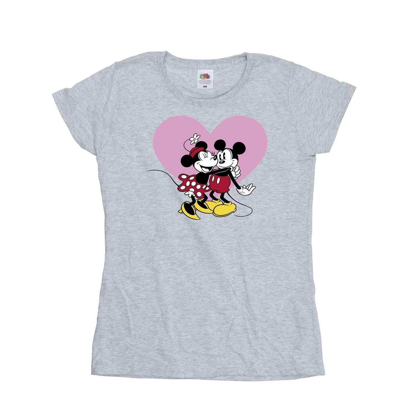 Ce T-shirt présente un charmant graphique de Mickey et Minnie Mouse s'embrassant, sur un fond de cœur rose. Le col rond classique et les manches courtes offrent une coupe confortable et polyvalente, ce qui en fait un ajout charmant à toute garde-robe décontractée.