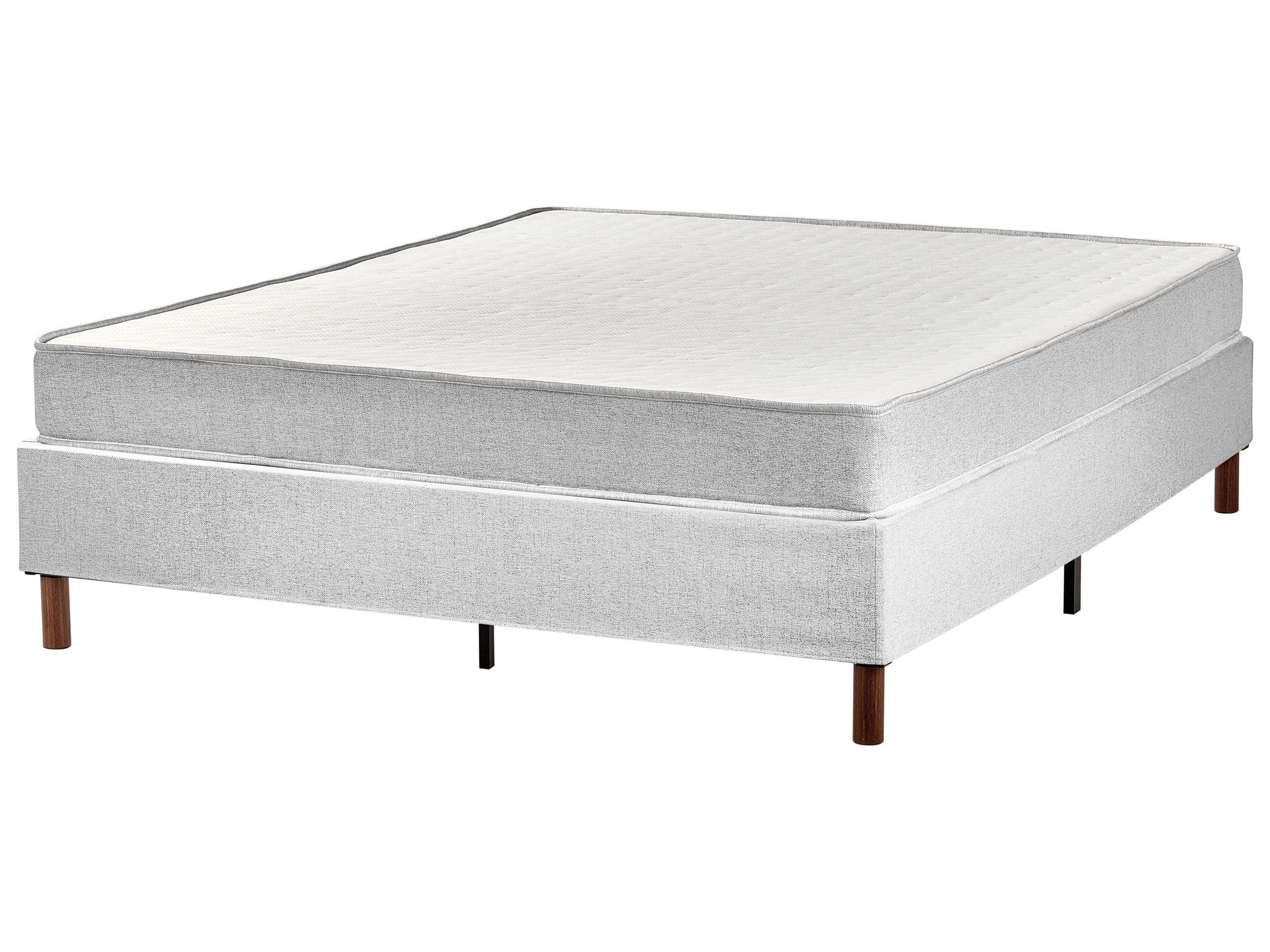 Sommier avec matelas. Ce lit moderne, au design beige polyvalent, s'intègre sans effort à une variété de styles d'intérieur, ce qui en fait un complément parfait à toute chambre à coucher. Recouvert d'un tissu doux, il est équipé d'un matelas à ressorts ensachés confortable qui garantit des nuits de sommeil reposantes et ininterrompues. Le solide sommier métallique à lattes offre un excellent soutien au corps, tandis que les pieds de haute qualité ajoutent une touche d'élégance et de durabilité à l'ensemble.