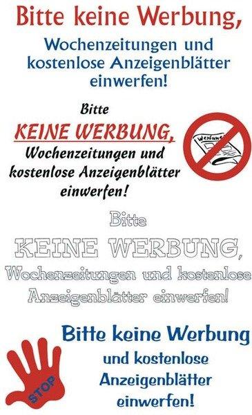 Hinweisetiketten Mit den Z-Design Hinweisetiketten "Keine Werbung" machen Sie am Briefkasten deutlich, dass Sie keine Werbesendungen annehmen möchten. Die wetterfesten Aufkleber gibt es in verschiedenen Designs, Farben und Materialien passend für jeden Briefkasten.