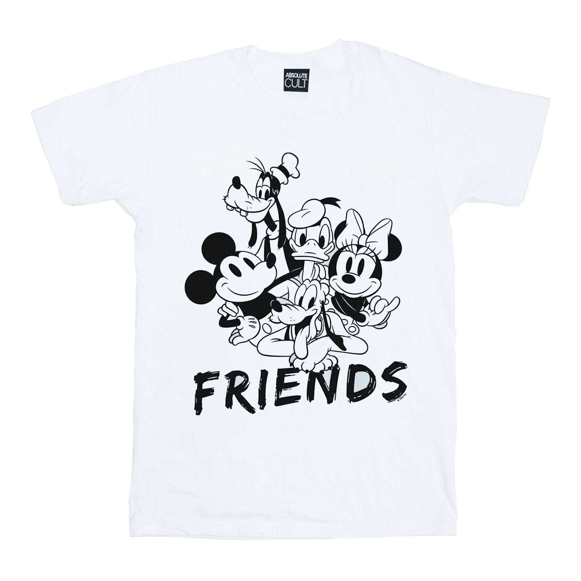 Ce T-shirt présente un design classique avec les personnages Disney bien-aimés. Le T-shirt met en scène Mickey Mouse, Minnie Mouse, Donald Duck, Goofy et Pluto, ce qui en fait un ajout parfait pour les fans de tous âges. Le graphique est présenté dans un style intemporel en noir et blanc, avec le mot «FRIENDS» imprimé sous les personnages.