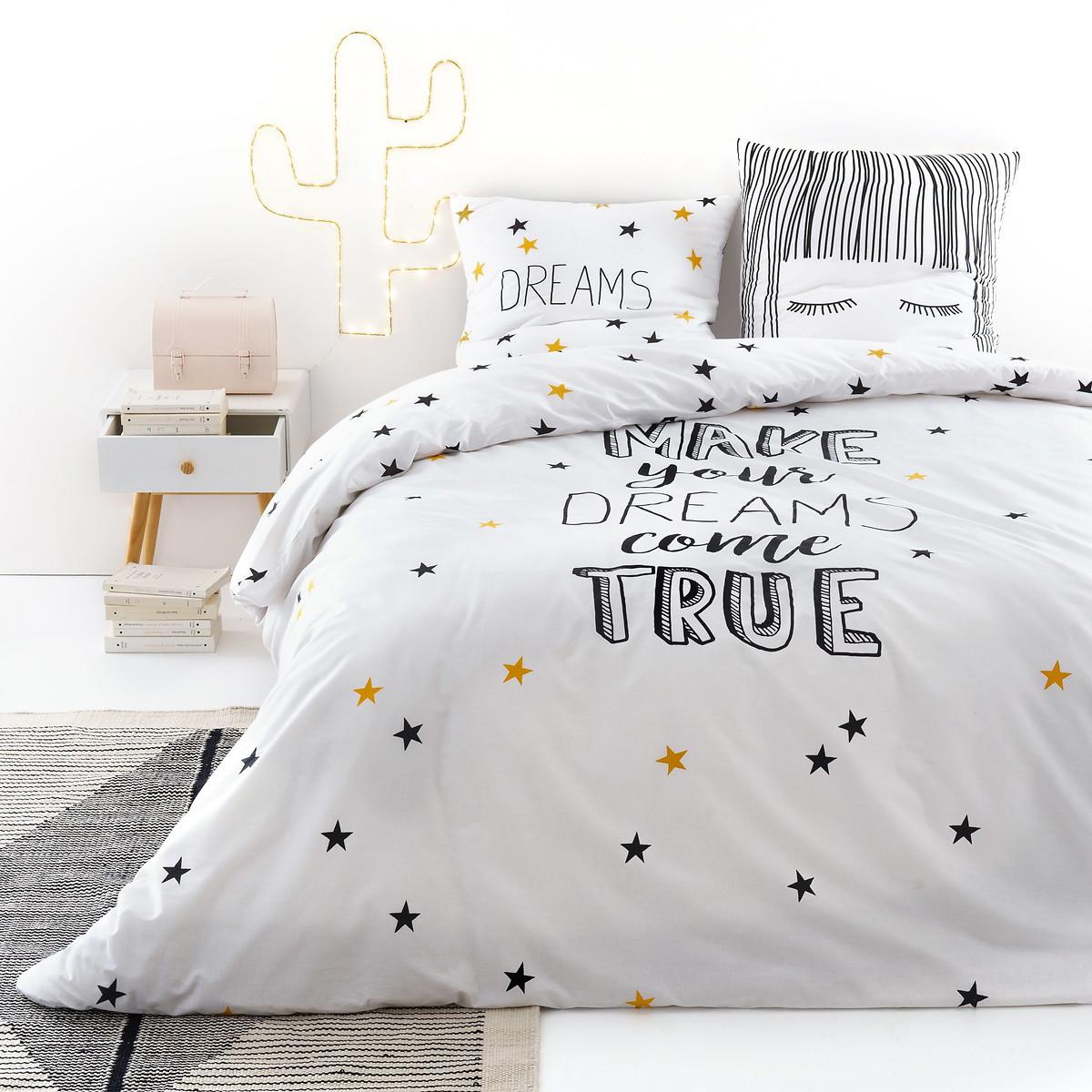 La housse de couette Fringe en pur coton offre une sensation douce et confortable. Le design, avec son motif étoilé ludique et son texte inspirant, ajoute une touche de fantaisie et de motivation à toute chambre à coucher.
