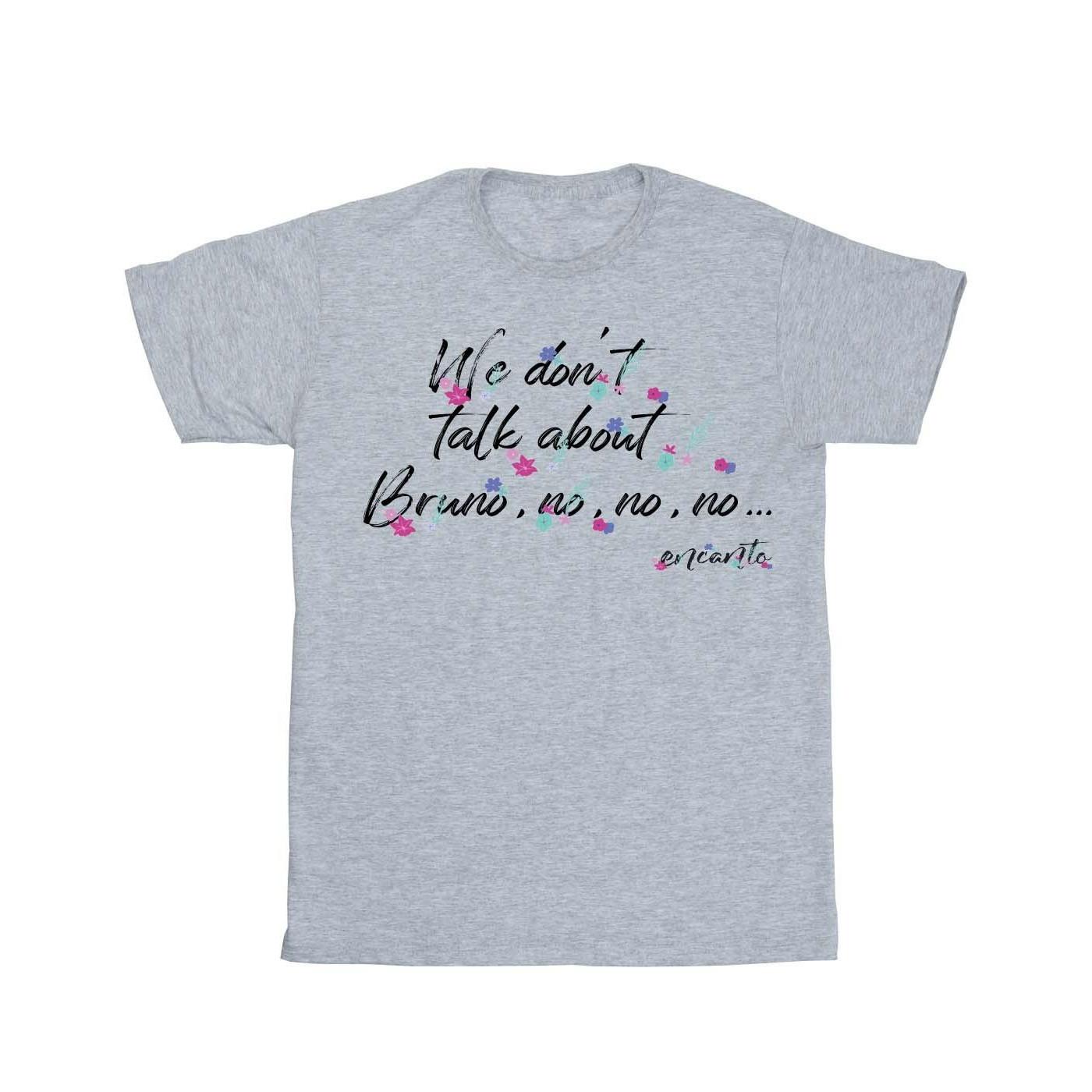 Ce T-shirt présente un imprimé graphique ludique inspiré de la chanson populaire du film Encanto de Disney. Le design inclut la phrase « We don't talk about Bruno, no, no, no... » dans une écriture stylisée, accentuée par des éléments floraux colorés. C'est un haut confortable et décontracté, parfait pour les fans du film.