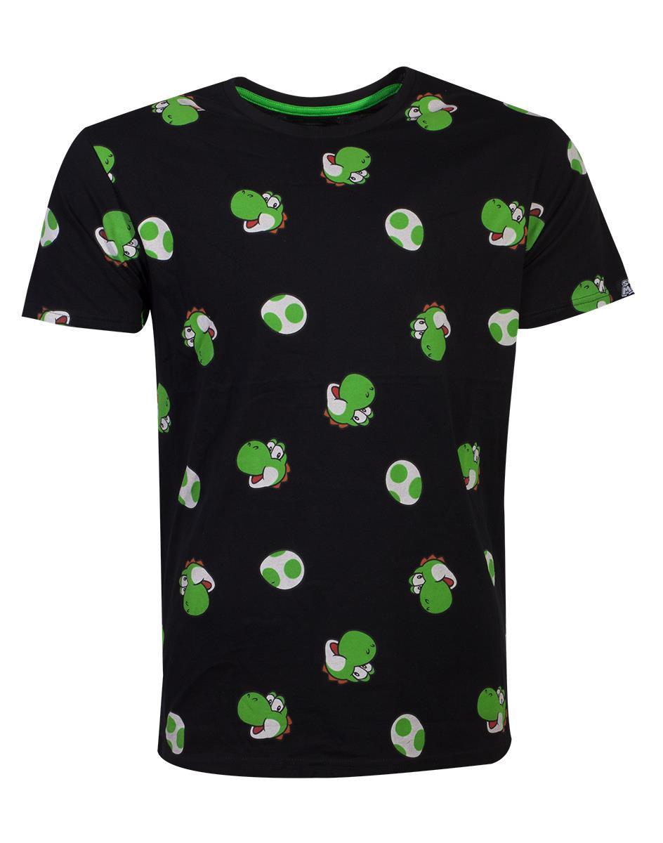 Ce T-shirt sous licence officielle présente un imprimé intégral ludique de Yoshi et d'œufs de Yoshi de l'univers Super Mario. Le col rond classique et les manches courtes en font un ajout confortable et polyvalent à toute garde-robe.