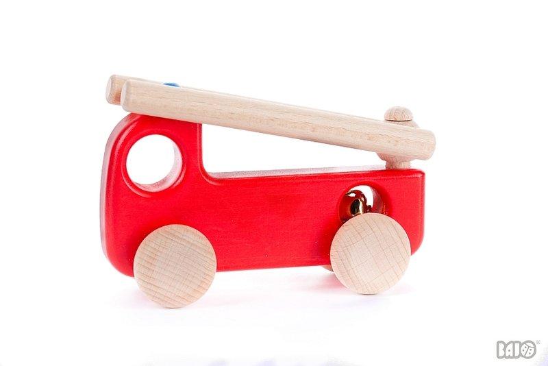 Camion de pompier rouge vif avec sonnette d'alarme et échelle en bois.