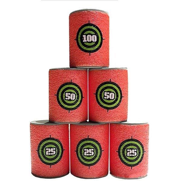Votre ami se vante d'être plus précis? Réglez-le une fois pour toutes et rivalisez pour celui qui est le plus précis entre vous! Ce paquet contient 6 cibles cylindriques avec différents numéros de score; trois avec 25, deux avec 50 et un avec 100. Les cibles sont en mousse légère qui tombe facilement après avoir été touché et ne laisse pas de trace sur le sol où elles sont tombées! Chaque cylindre a une taille d'environ 6,5 cm de hauteur et 4,5 cm de largeur avec une couleur rouge pour être facilement repéré.