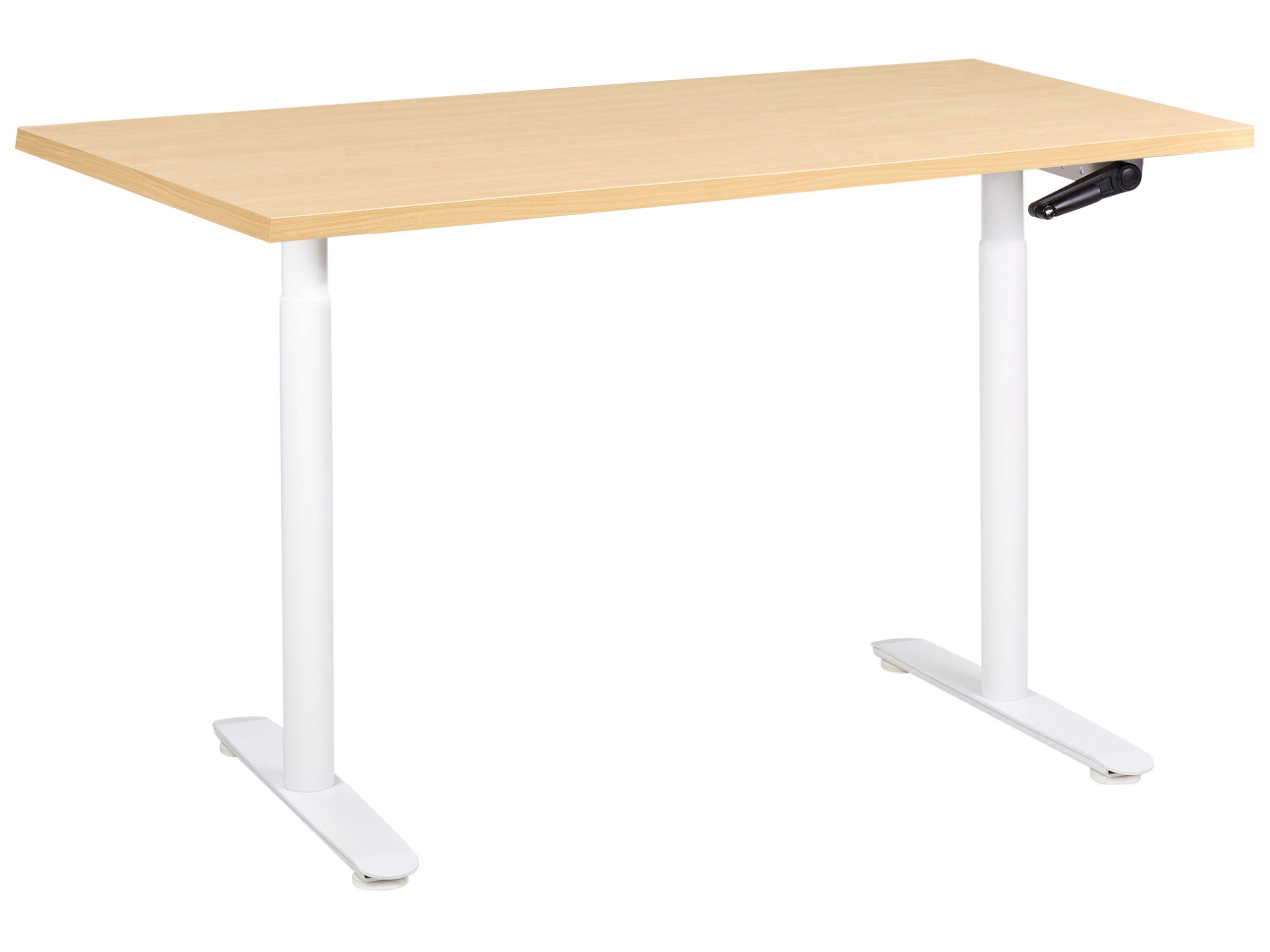 Bureau assis-debout à hauteur ajustable. Ce bureau est équipé d'un mécanisme à manivelle qui permet un réglage en hauteur sans effort, rendant le passage de la position assise à la position debout fluide et confortable. Ses pieds larges assurent une bonne stabilité, tandis que le plateau stratifié est facile à entretenir. La combinaison d'un plateau recouvert de mélamine et d'un cadre en acier robuste garantit une grande solidité et une capacité de charge élevée, ce qui le rend adapté à un usage quotidien.