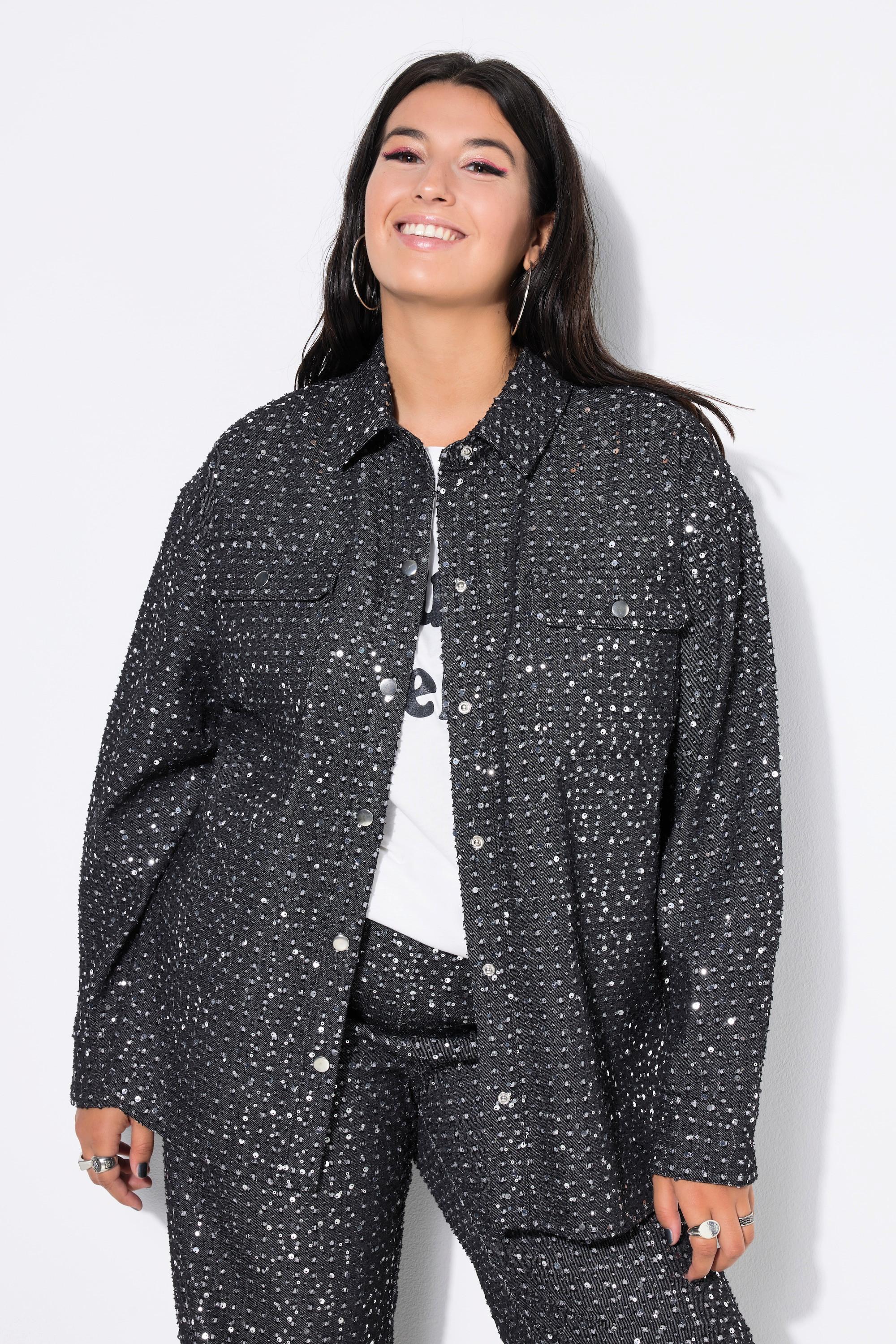 Cette veste-chemisier oversize est ornée de paillettes scintillantes, offrant une interprétation glamour d'une silhouette classique. Le design comprend un col traditionnel et une fermeture boutonnée sur toute la longueur, ce qui en fait une pièce polyvalente pour diverses occasions.