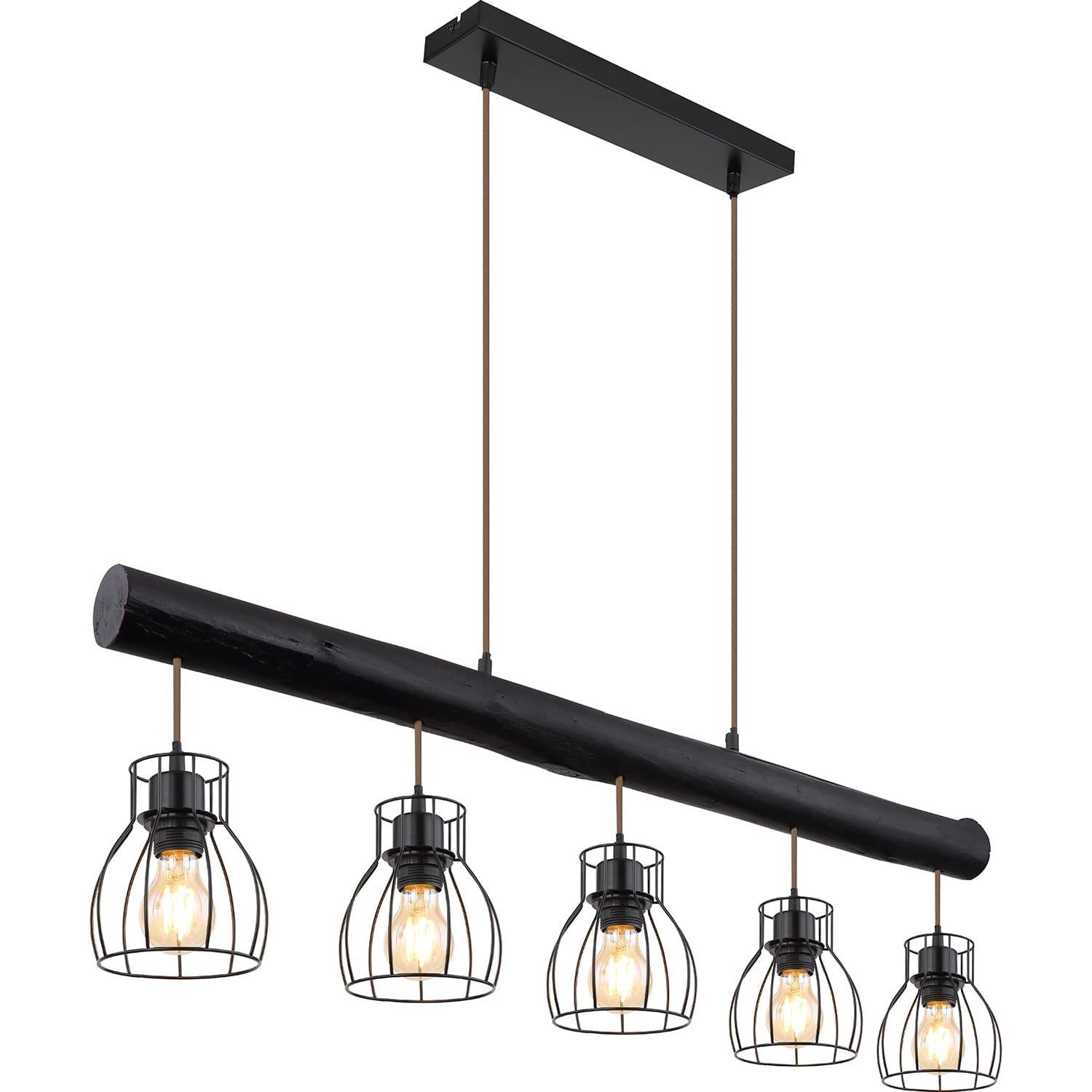 Lampe à suspension métal noir mat, bois noir, métal noir, câble textile champagne, poutres en bois brûlées, LxlxH : 1040x136x1400mm, exclu 5x E27 60W 230V.