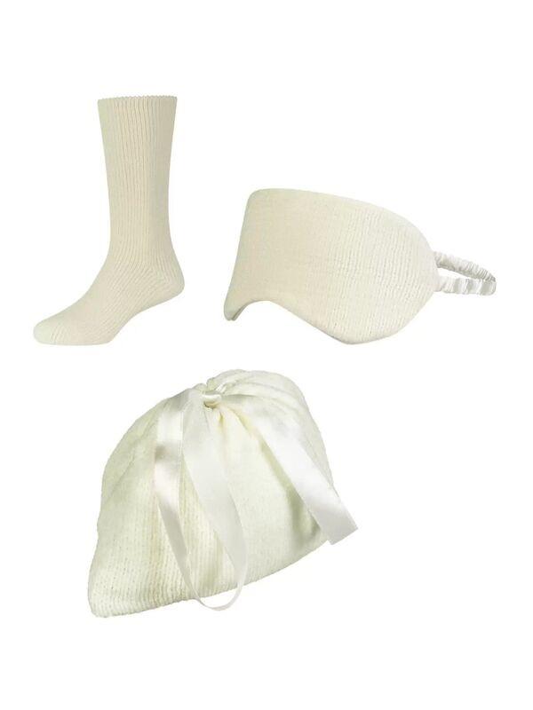 Ce set Travel & Relax est conçu pour le confort en voyage ou à la maison. Il comprend une paire de chaussettes douces et un masque de sommeil confortable, le tout présenté dans un sac à cordon assorti.