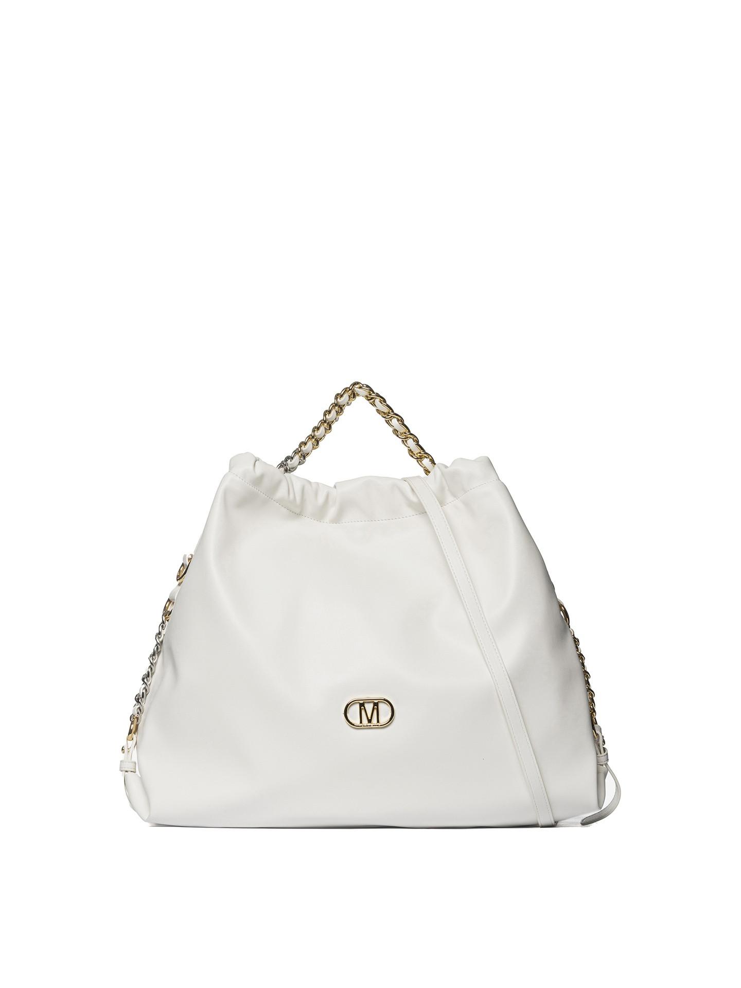 Cet élégant sac à main présente un design doux et froncé avec un logo métallique proéminent sur le devant. Il est équipé d'une élégante bandoulière chaîne qui combine des tons or et argent, offrant un accessoire polyvalent et chic pour diverses occasions.