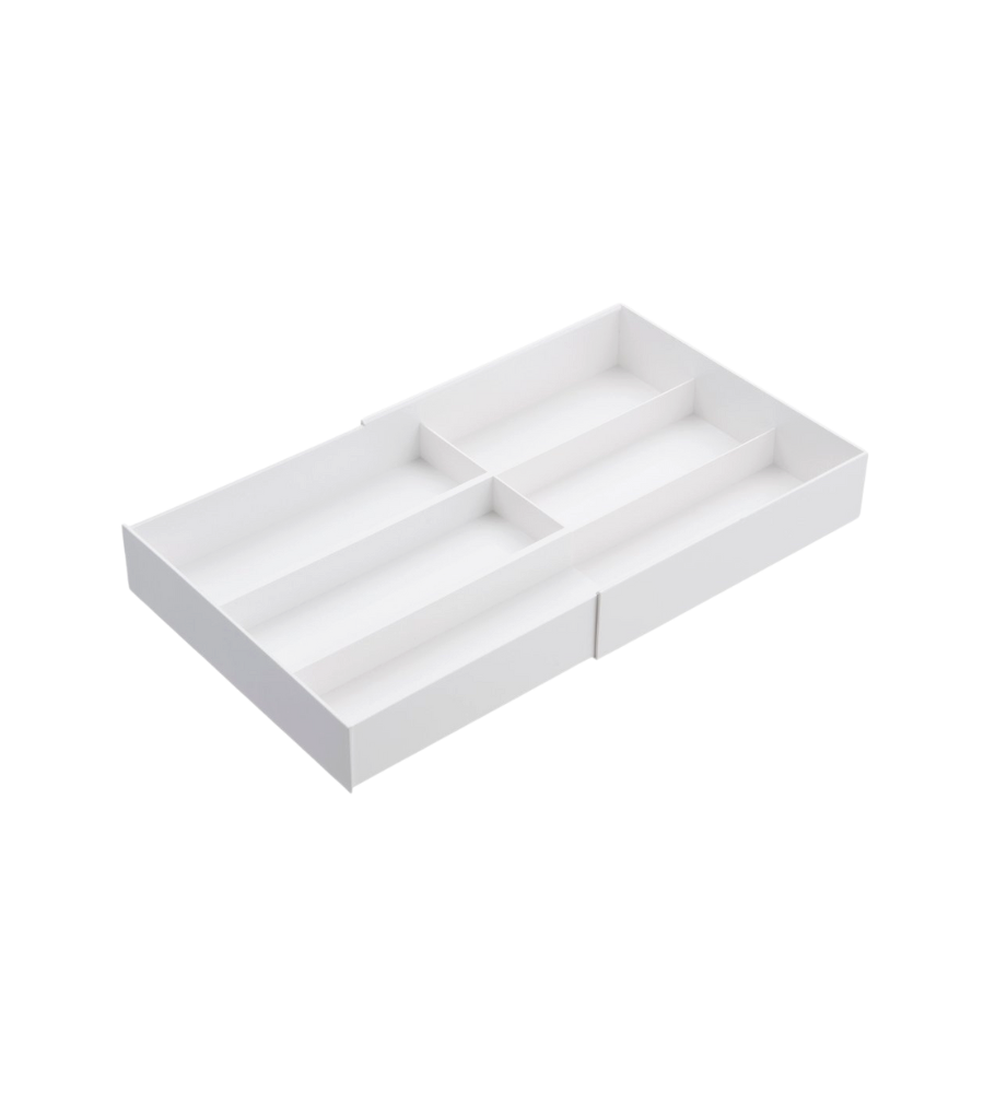 Avec l'organisateur de tiroirs TOWER pour la cuisine en blanc, vous mettez de l'ordre dans vos tiroirs.Divisez rapidement et facilement les tiroirs en différentes zones et obtenez une vue d'ensemble ordonnée. L'organiseur se compose de deux niveaux, ce qui permet d'avoir rapidement à portée de main les objets les plus petits ou les plus utilisés.L'organiseur de bureau Tower ne convient pas seulement à la cuisine, mais peut être utilisé pour tous les tiroirs, par exemple au bureau, dans la salle de bain, pour le maquillage, etc.L'organiseur de tiroir est extensible en longueur et s'adapte ainsi idéalement au tiroir.
