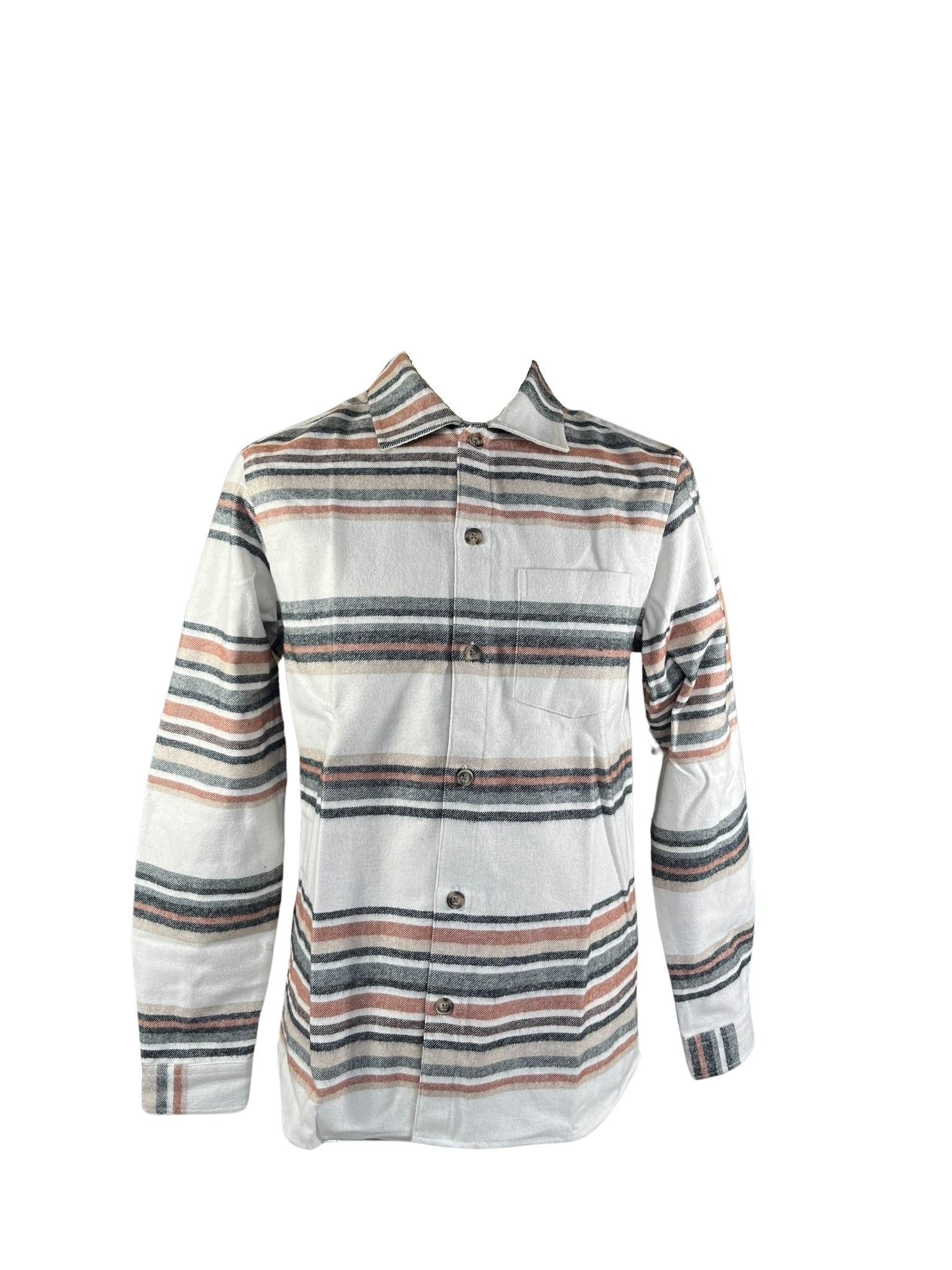 Cette surchemise à manches longues présente un motif rayé, une poche poitrine, une étiquette de marque sur la patte de boutonnage intérieure et une fermeture boutonnée. Elle offre une pièce polyvalente à superposer avec une coupe régulière.